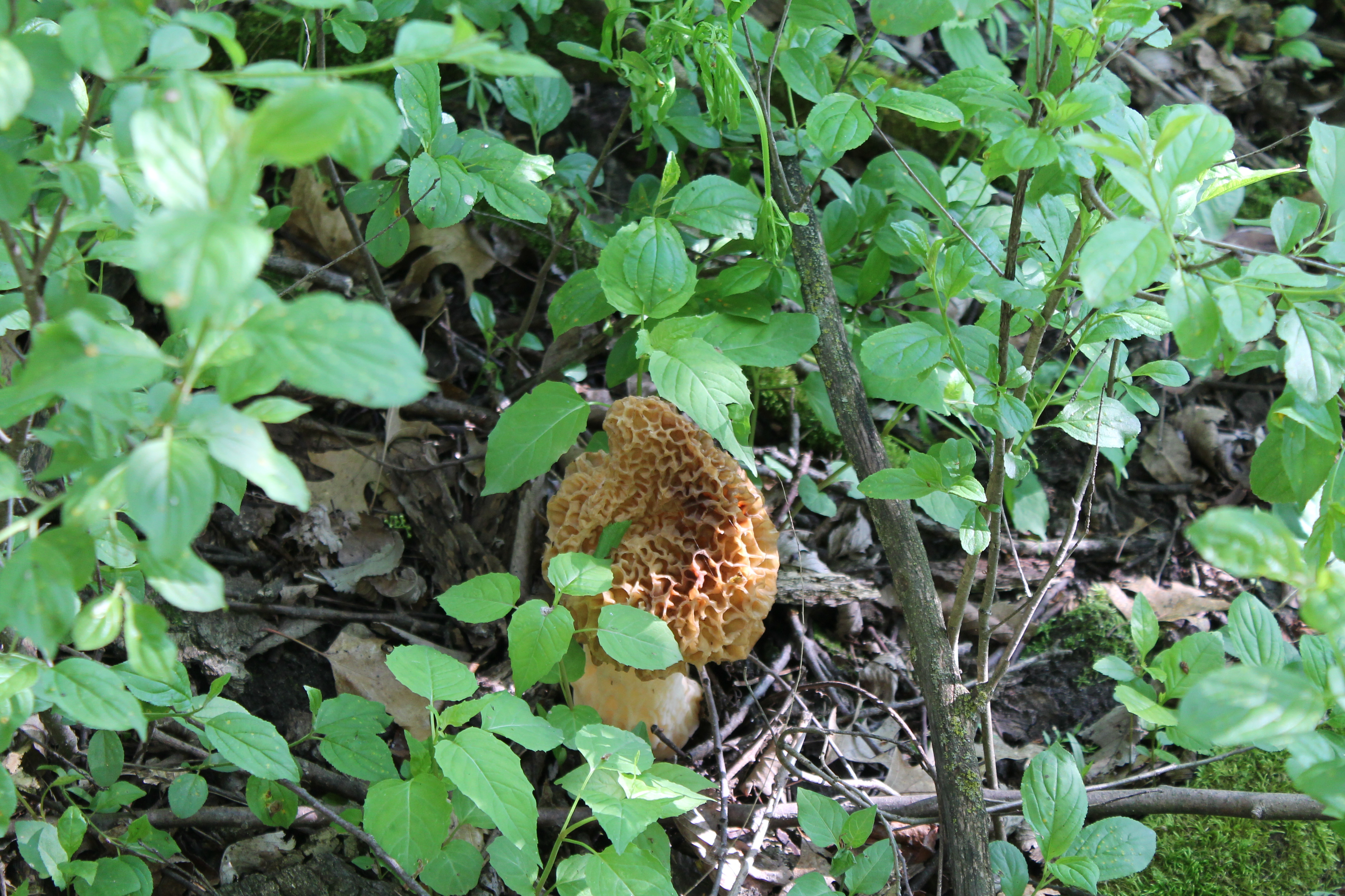 I was going mushroom hunting, looking for dryads though a few morels would be delightful, I didn’t think I’d find any or at best only a couple. To save some time (I had only an hour and a half before I had to get back to make cheese), I took the truck to the edge of the woods, parked it at the bottom of the hill. Before going into the woods, I surveyed them, trying to figure out where to go in. I wasn’t exactly at the bottom of the hill when I entered into the woods. There weren’t any clear paths in, the trees and shrubs were quite thick. With camera around my neck, knife in one hand, two paper bags in the other hand, I pushed my way into the woods. Unfortunately not soundlessly, branches snapped a few times and my feet crunched on the leave litter covering the ground. Branches snagged my clothes, sometimes nearly taking my hat. I barely stepped under the canopy of trees when I spotted the first couple mushrooms. Medium sized morels, that were getting a little old, probably should have been picked yesterday or the day before that. I was so excited to find a morel so late in the season, so quickly and on my own. I cut a couple and put them in my bag, another was too far gone so I left it. (I meandered all over in the woods, crisscrossed and turned completely around, constantly changing directions, my retelling may not be exactly chronological and individual moments blurred together.) I went up a little and around the tree where I found the morels, ducking branches and searching the ground. Only a few steps later, I started going downhill. There were many deer trails in the woods, allowing more space to stand upright. Morning sunlight filtered into the woods. The woods felt so peaceful, a great place for solitude. Standing under those trees, a green slope, spring flowers blooming, speckled sunlight, I felt my soul uplifted, quieted, I felt worries and cares slough off for awhile.