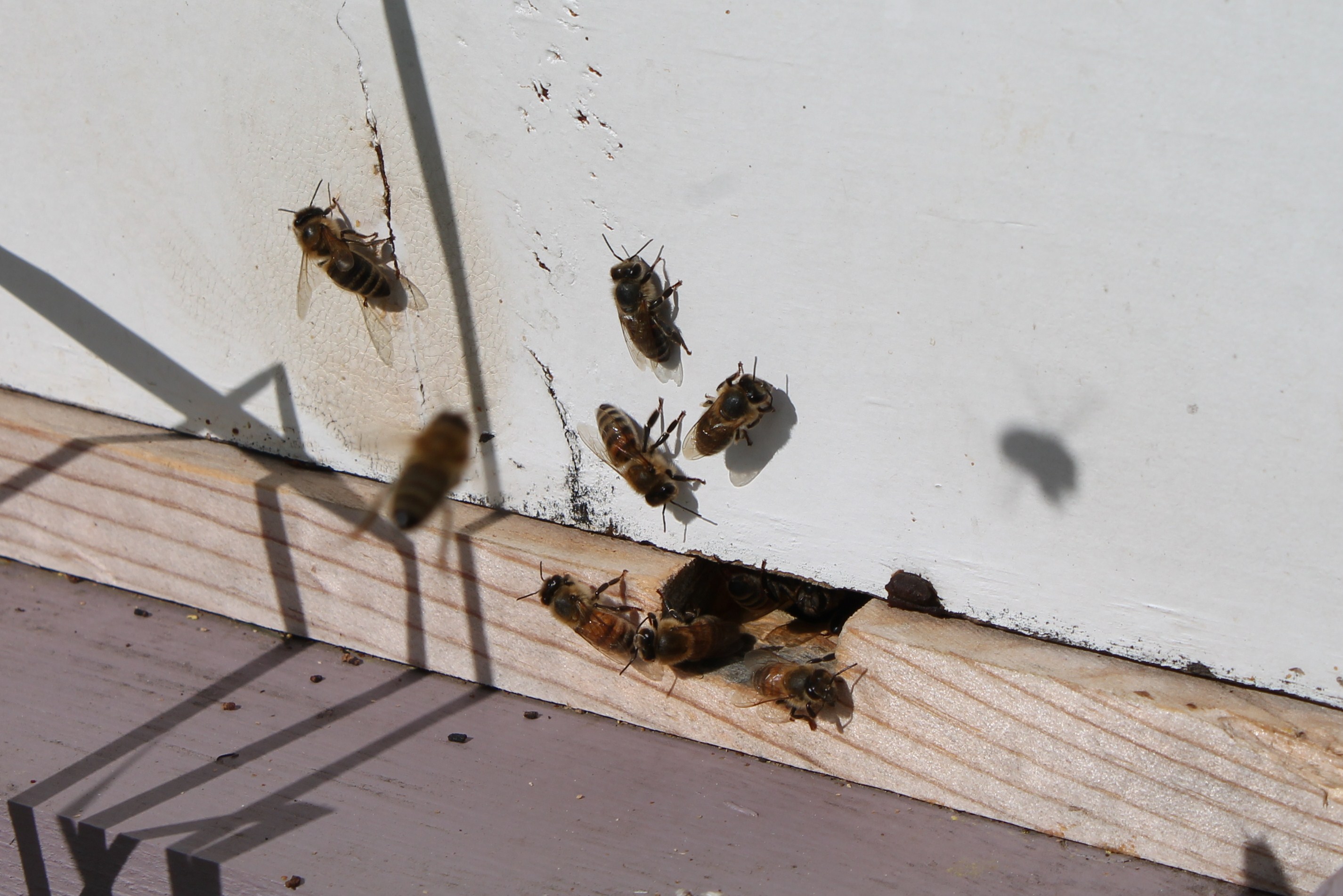 I wasn’t able to fall asleep until 2:00 am, my thoughts buzzed with bees and the fact I still had to medicate them. My shoulder hurt too. And of course I awoke before 6:30 am. The bees had calmed down anyway. Jason and I used smoke this time. He smoked them while I opened them up, sprinkled the antibiotic on the brood frames, then put the inner and outer covers on. Jason helped me adjust how the boxes were sitting on the stands so there were no gaps and the entrance reducers were in the right place. We also treated his hives. My bees already had full pollen baskets too.