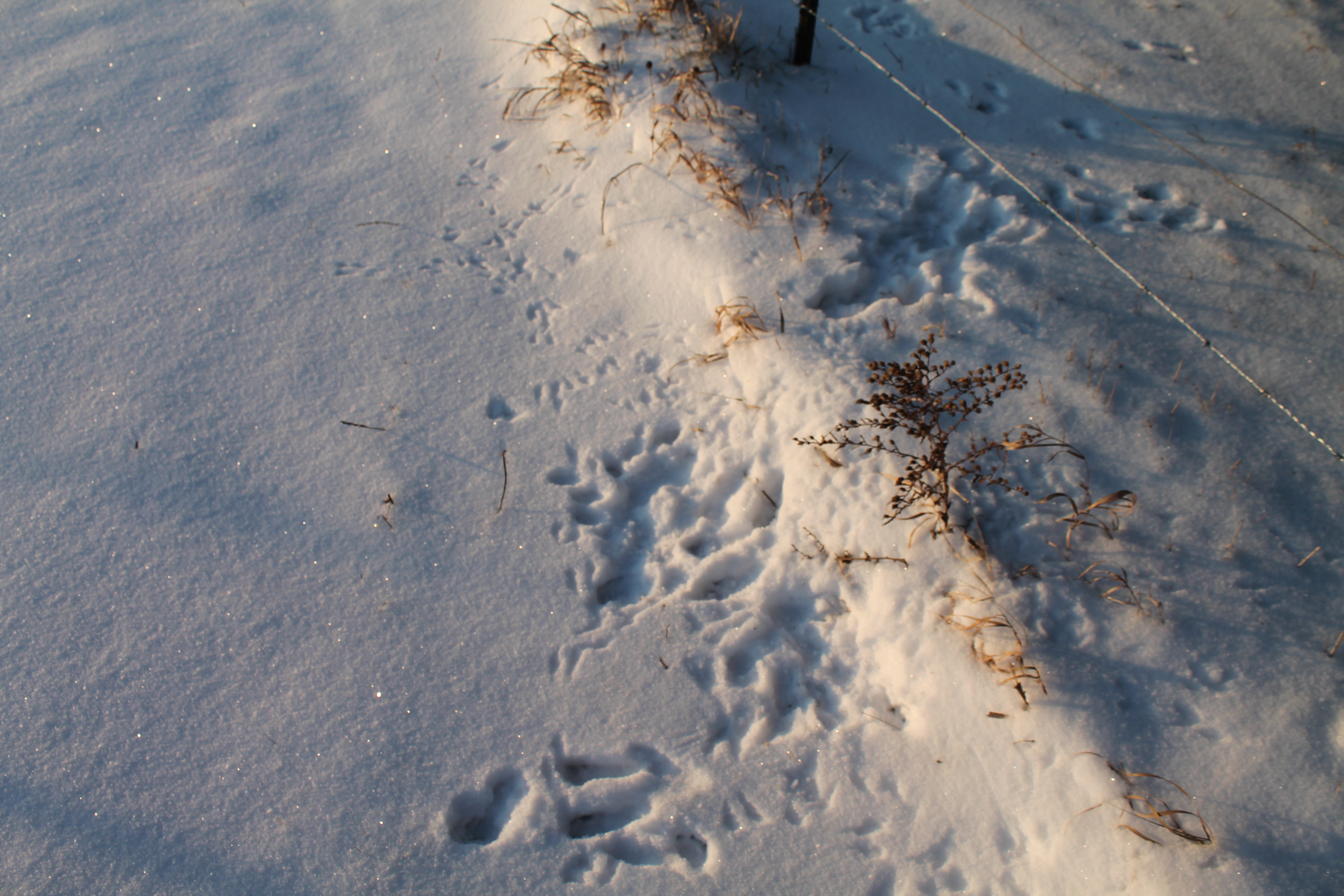 I soon came to another pen for calves on my right; the pasture fence was still on my left. There the animal traffic had been quite busy. There was a confusion of tracks going under the fence of the pen. The most prominent of them were rabbit tracks. Far too many rabbit tracks criss-cross our yard and farm, I wonder if there are much for predators around.