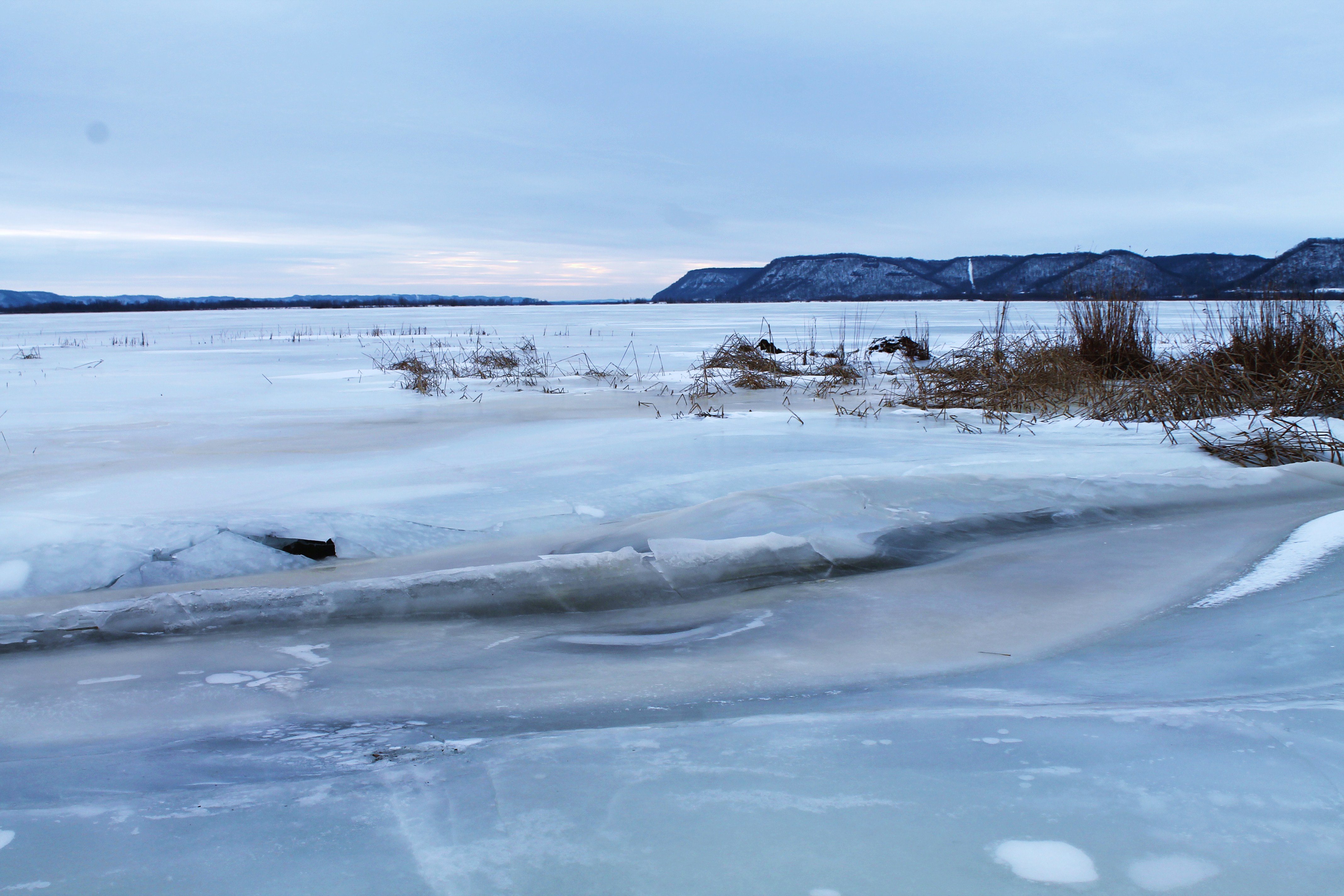 Once over the ice ridges, we turned a little to our left, following a frozen water path through tall wild rice, tangled rushes, and trees here and there again. Pockets of snow were tucked in the bent and tangled vegetation. Open ice was again before us in a couple of minutes. The cold slowly seeping into my body from the wind became more apparent; however, I tried not to pay attention to it. Instead I surveyed the lake before me. The ice somewhere between white, gray and blue had been smoothed by the wind. Individual stems and small clusters of stems poked through here and there. Again, the majestic blue bluffs rimming the horizon, cradling us, gave the feeling of safety and comfort. The sky and ice seemed almost the same in color and texture, the sculpted bluffs delineated between the two, a phenomenon that could have driven early explorers crazy, but that I found incredible.