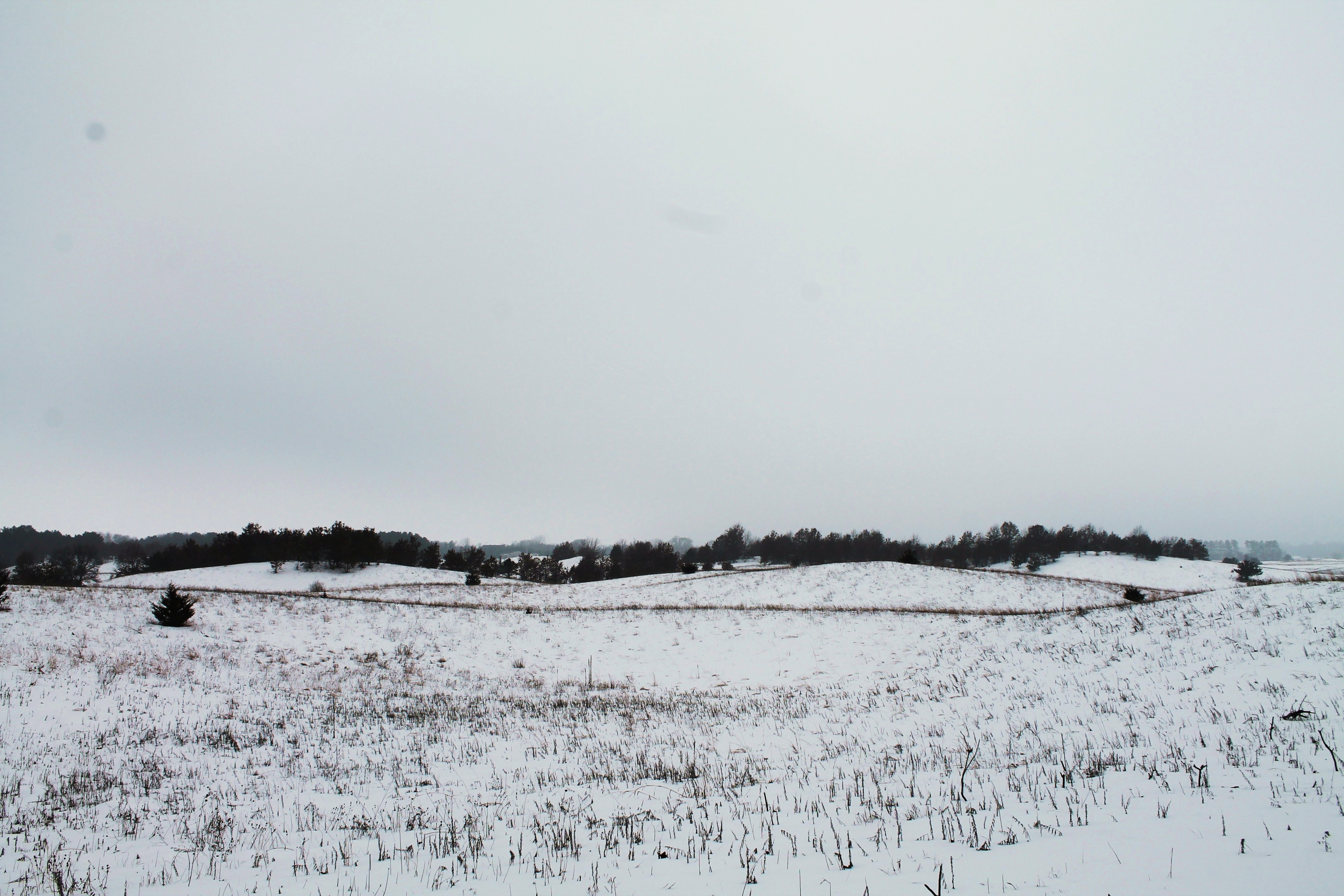 I gazed out over the dunes, rolling mounds, stippled with dried plants above the snow, individual cedars here and there, with a line of pines in the distance. It’s a different kind of beauty from a stream winding through a deciduous forest, but still quite lovely. The sky was heavily overcast; it had been foggy when I drove down to Larry’s. The thick cloud cover made for terrible photography conditions but, of course, I took photos anyway. I marveled at how vast the sand dune prairie appeared. The rolling sand dunes seem almost random –where did they come from? What are they doing here? – Not other worldly, but in the wrong place. I noticed animal tracks in the snow here and there but didn’t look closely enough to identify them.