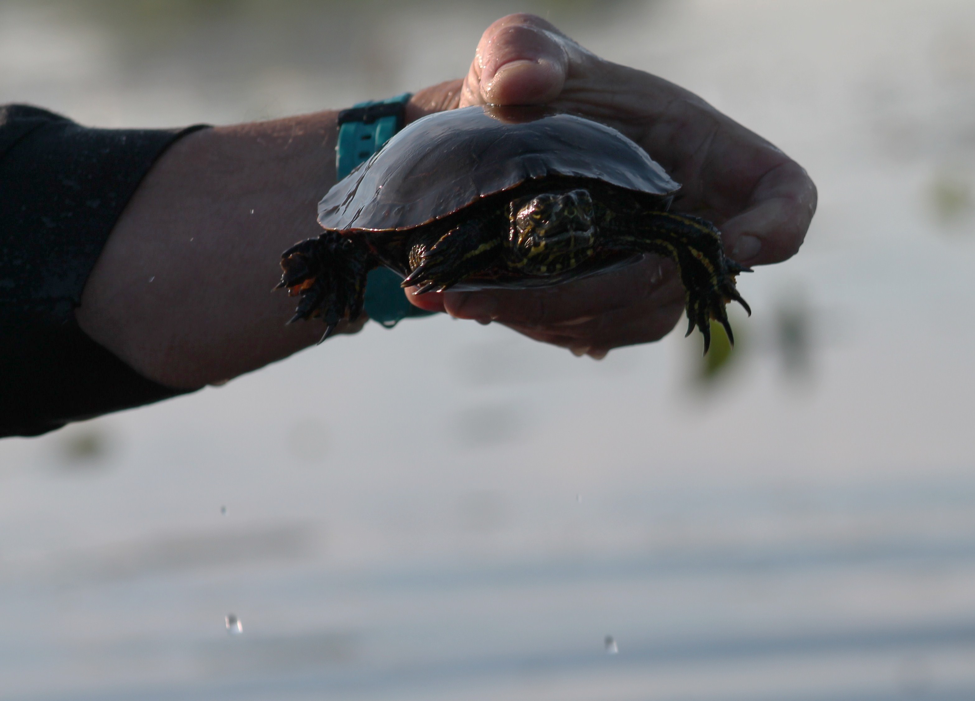 “Look to your left,” instructed Larry. I turned my head a little but didn’t see anything. “Further, further,” Larry instructed patiently, as I continued to search. “There’s a turtle.” I still didn’t see it. “Right next to you.” The canoe glided forward. I still didn’t see it. Larry reached down and picked up a painted turtle. Water dripped from it. I turned around to take a picture. Making the turtle talk, Larry said, “Hi, Bethany. Take my picture.” The turtle was looking at me, not so sure about the whole thing. Toes spread, claws extended, wondering why it wasn’t still swimming below the water’s surface. A beautiful, elegant creature, incredibly adapted for its life style. In a matter of moments, Larry gently returned the turtle to the water.