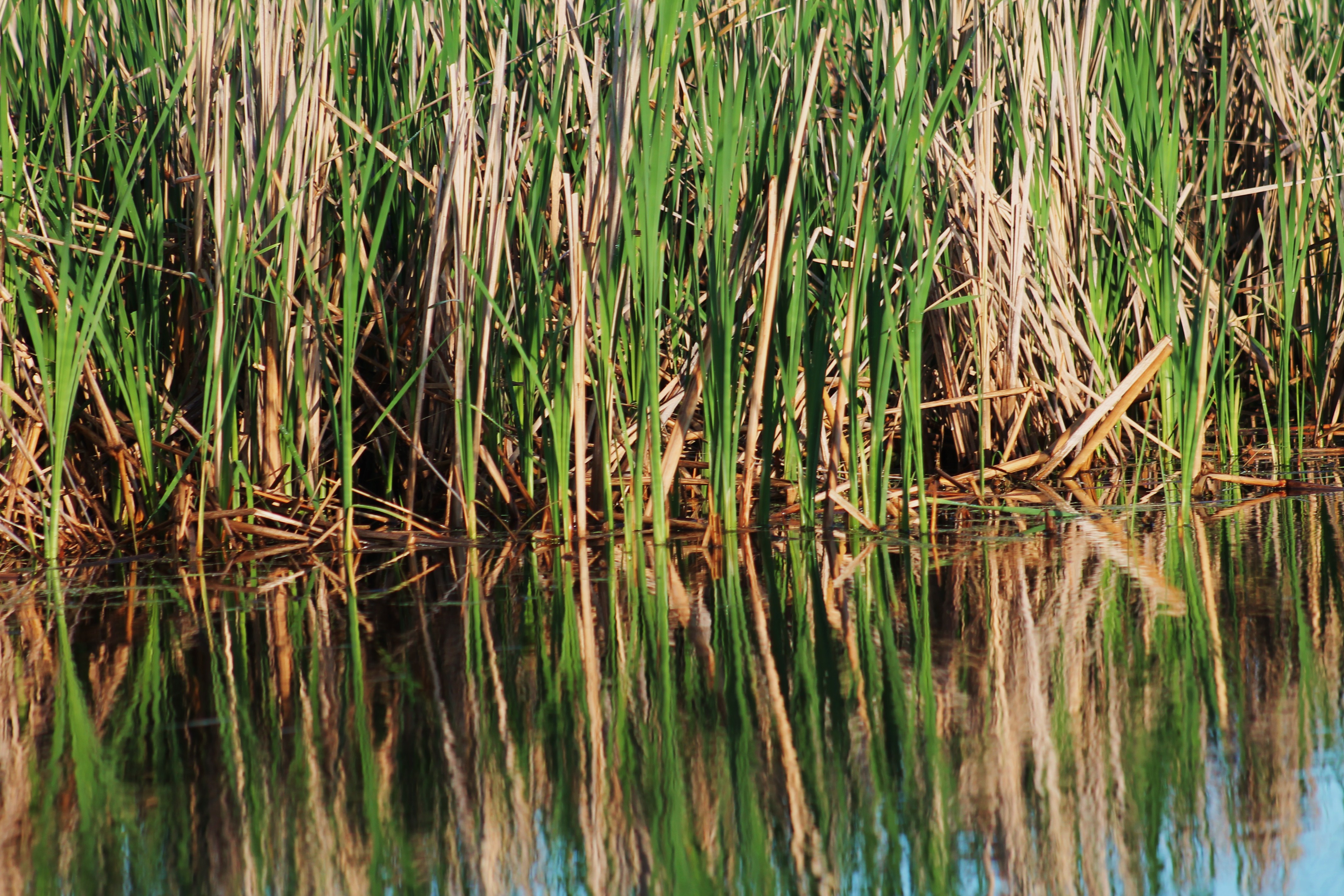 The sun was starting to get warm, I contemplated taking my jacket off but then a gentle northwest wind began to blow. I picked up the paddle and helped Larry, as we began to turn a little to our left, heading more west instead of north. The current had turned; we were continuing to follow it. Facing into the breeze was a bit cool, my eyes became a little watery, my nose a little runny. I took in the greening cattails and lovely snags, barren, sticking up out of the water. I marveled at the geese and took in the beauty of the aquatic, green and brown plants reflecting in the water.
