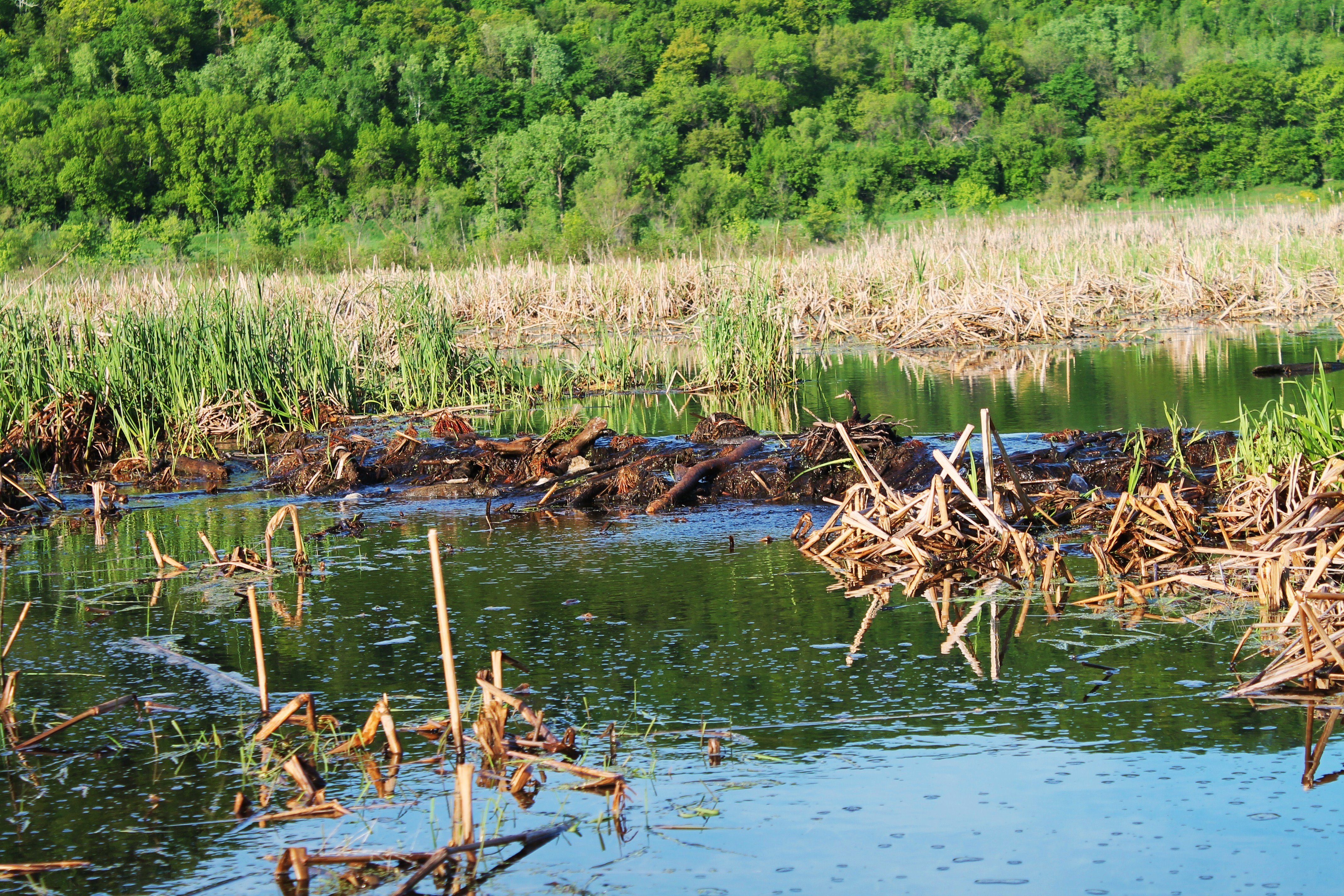 Larry and I paddled against the wind and current, which was getting a little tricky. Larry said, “I was hoping we’d get as far as the beaver dam.” So we kept paddling. The lake-like channel had narrowed considerably, a little more than twice the size of the canoe. The vegetation grew more thickly, clumps of bright green cattails and brown vegetation.