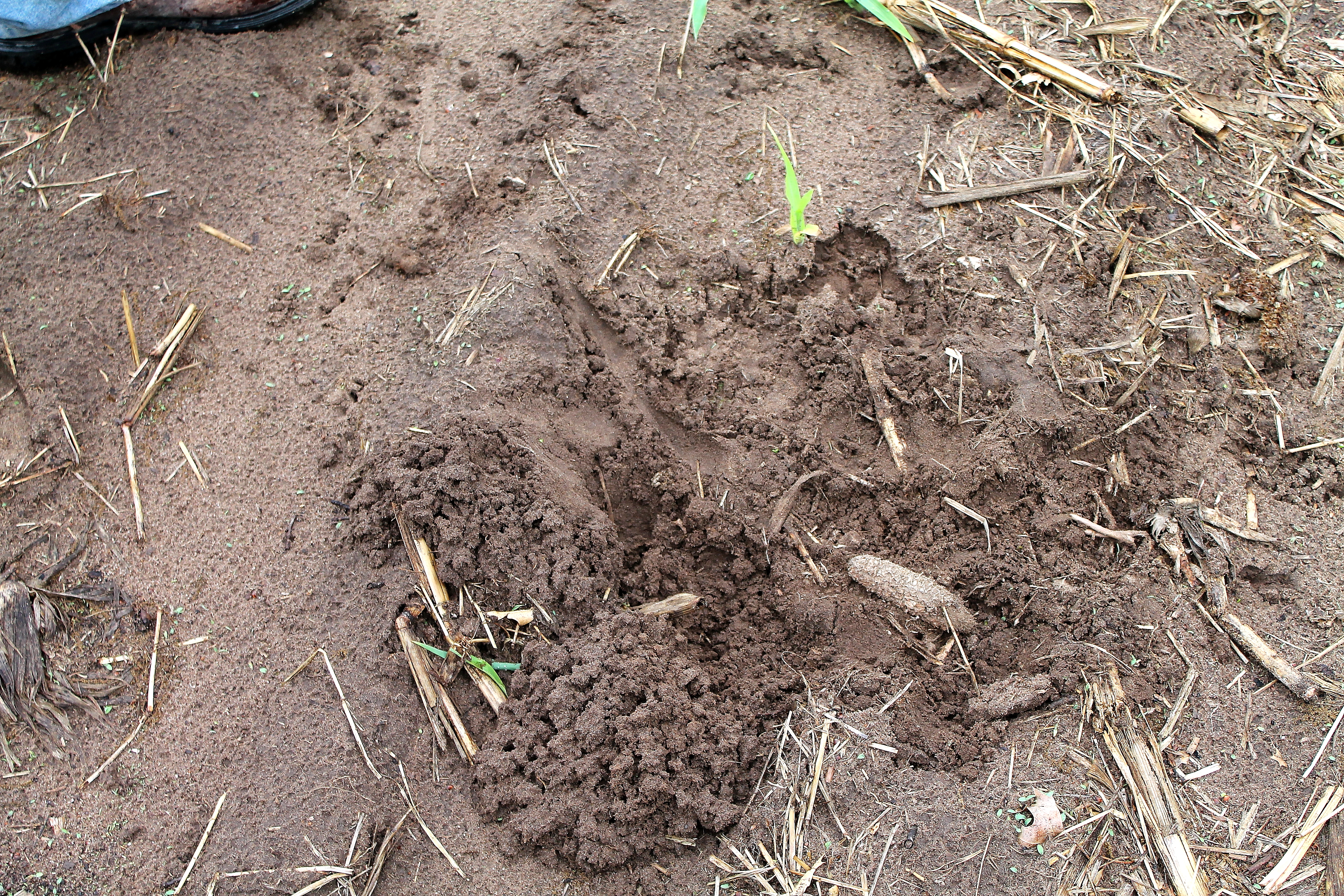 Jon Schmoker invited Larry and me to go along with him while he looked for snapping turtles and their nests. The temperatures had warmed up enough over the weekend that the turtles were on the move. Larry and I met up with Jon at his place shortly before 7:00 pm. I hoped we’d actually see the nesting turtles. There had been thunderstorms and rain throughout the afternoon, which had subsided to a few sprinkles off and on by evening. The temperature was high, around sixty seven degrees. High temperatures combined with thunderstorms made for ideal turtle activity. Jon was just finishing loading his ATV with the needed equipment when we arrived. We climbed in, and we were off. We went back up Highway 84 a little bit, pulled into Les Schmoker’s driveway, just before the bridge, continued past his house along the sandy drive, then turned left on the drive, and followed that for a little ways. We stopped near the cornfield on our left, to our right were woods, the same woods which Larry and I carried the canoe through last October. We were southeast of both Jon and Les’ houses.