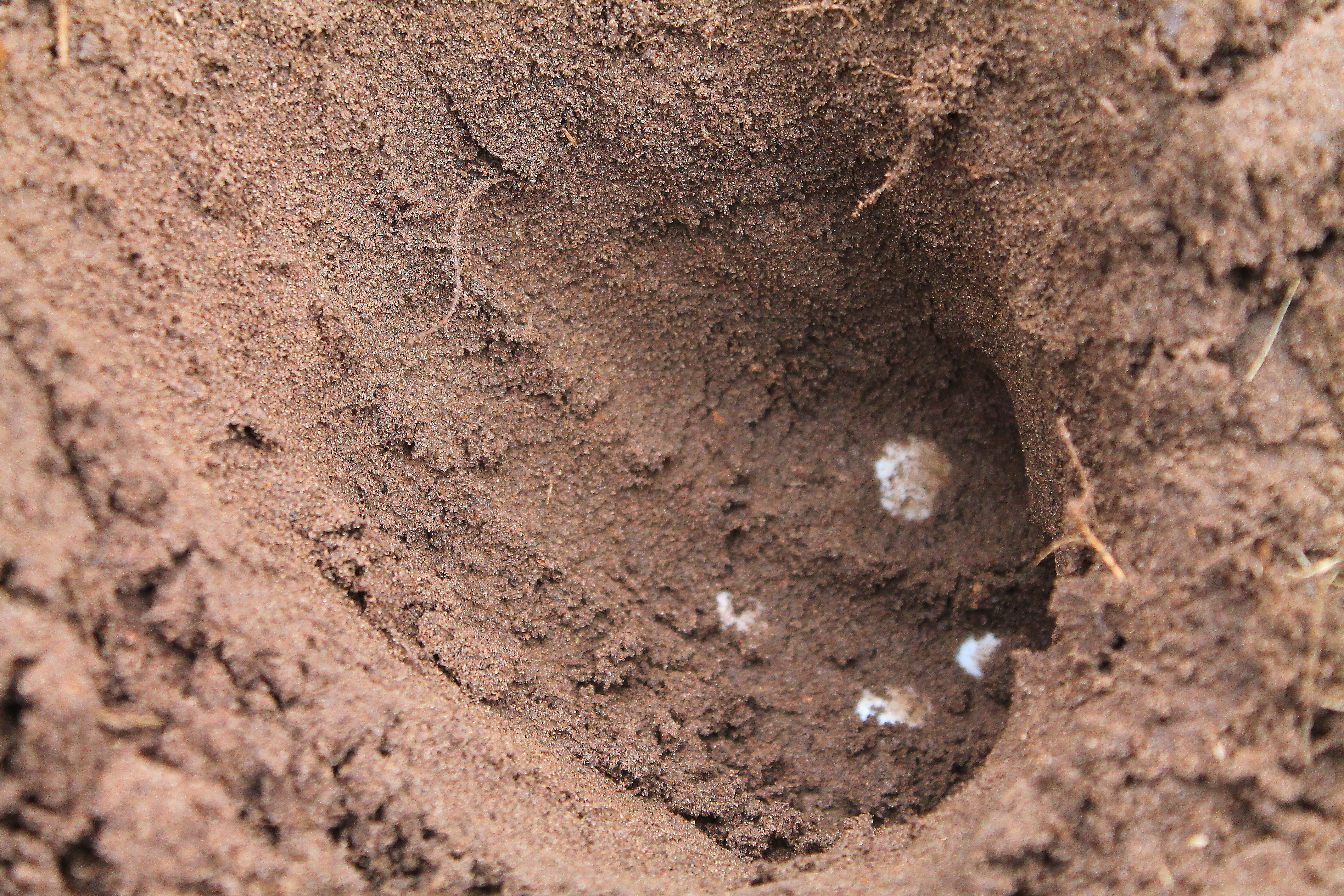 The cornfield was our destination. The soil was completely sand, ideal nesting grounds. First, Jon showed and explained a test dig to us as we found a spot where a turtle had started digging but decided not to nest there. It was all new to me and exciting; very neat to see the print of the turtle, body, legs and, most prominently, tail in the sand, like a snow angel. It was so exciting to think a turtle had been there perhaps not too many minutes ago. We continued walking through the field. Jon found a nest – the print of the turtle wasn’t visible. Jon carefully poked a stick into the nest to make sure it was actually a nest. Larry joked to Les Schmoker, who had driven over in his truck to see what we were doing, “I feel like I’m watching a diviner search for water.” Jon was able to feel eggs within. However, just double checking, and probably more for my benefit, Jon proceeded to dig up the nest a little. I peered down into the nest and observed four white splotches in the sand, eggs still mostly submerged. Jon very tenderly pulled an egg out so I could get a better look at it. The egg was a small white gray ball, between a ping pong ball and a golf ball in size.