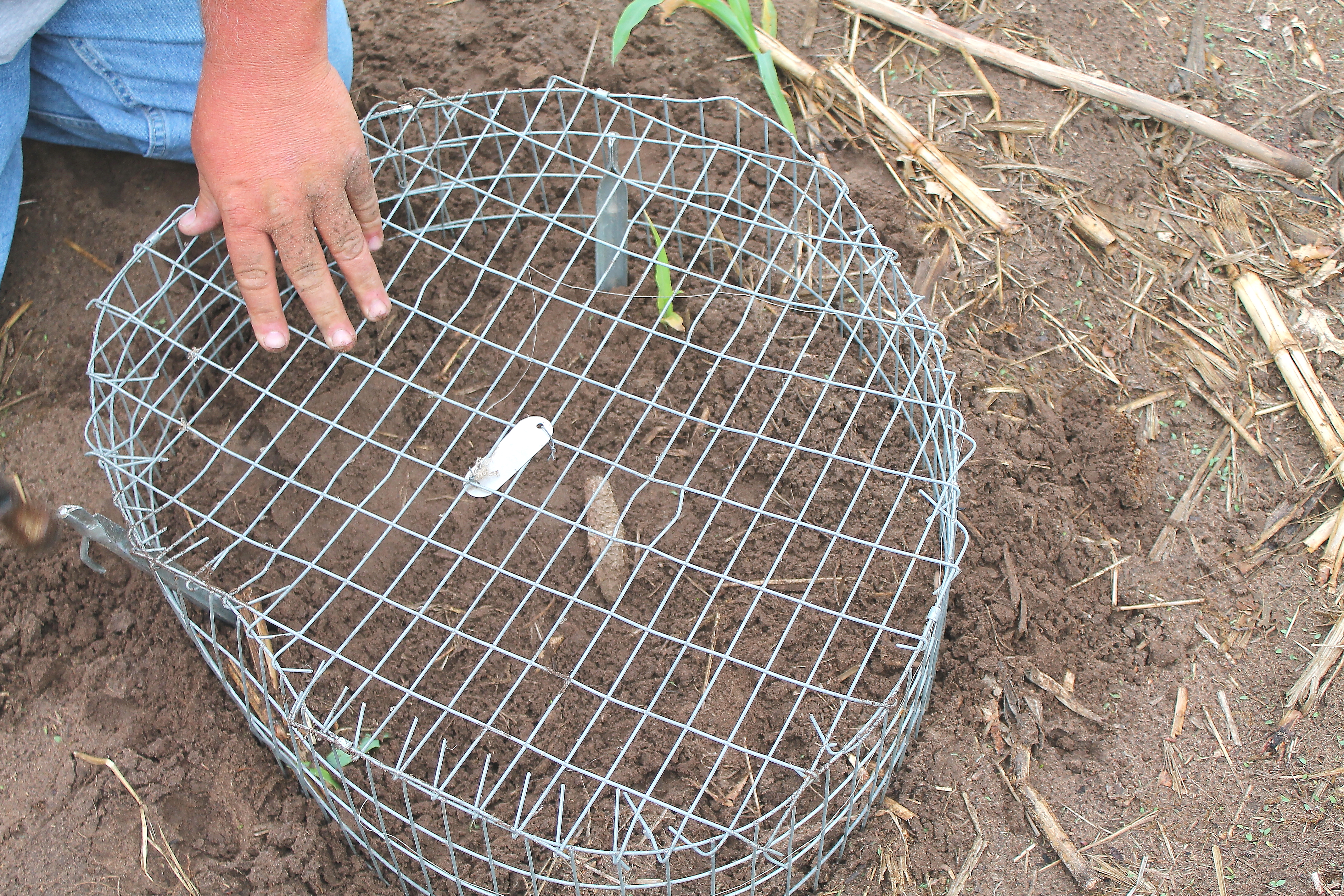 He explained that there is a white spot on the egg, the baby turtle attaches to that with its egg tooth, so it should be facing up. Hatchlings use their egg tooth and claws to break out of their shell and then dig their way out of the nest. From there, they have to find water. Jon carefully returned the egg and then filled the hole back in, covering the nest up better than the female turtle had done. Next, he placed a wire cage over the nest and pounded stakes in to hold it. He stuck a pole with tape on it inside too, to mark the spot when the corn is tall. The cage will hopefully keep raccoons, skunks and coyotes from eating the eggs. Fox, mink and opossum will also dig up nests and eat the eggs and crows may snack on a hatchling as it makes its trek to the water. The destruction rate of nests in some areas is 90% and death rates of hatchlings is from 60% – 100%, which means of the 10 -100 eggs lain by a female in one clutch, only about 30% (on average) will survive to adulthood. Adult snapping turtles have few predators other than humans and their vehicles.