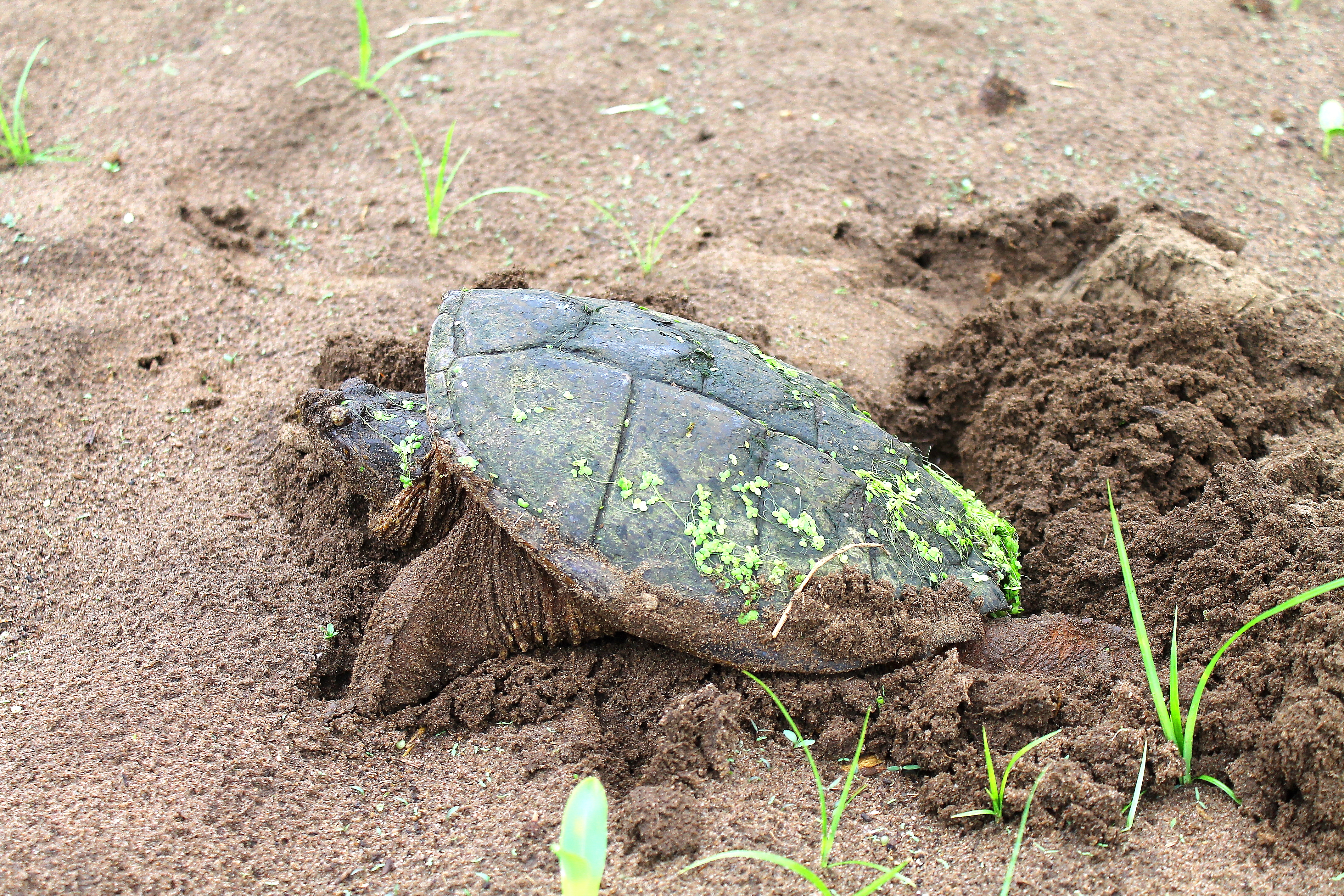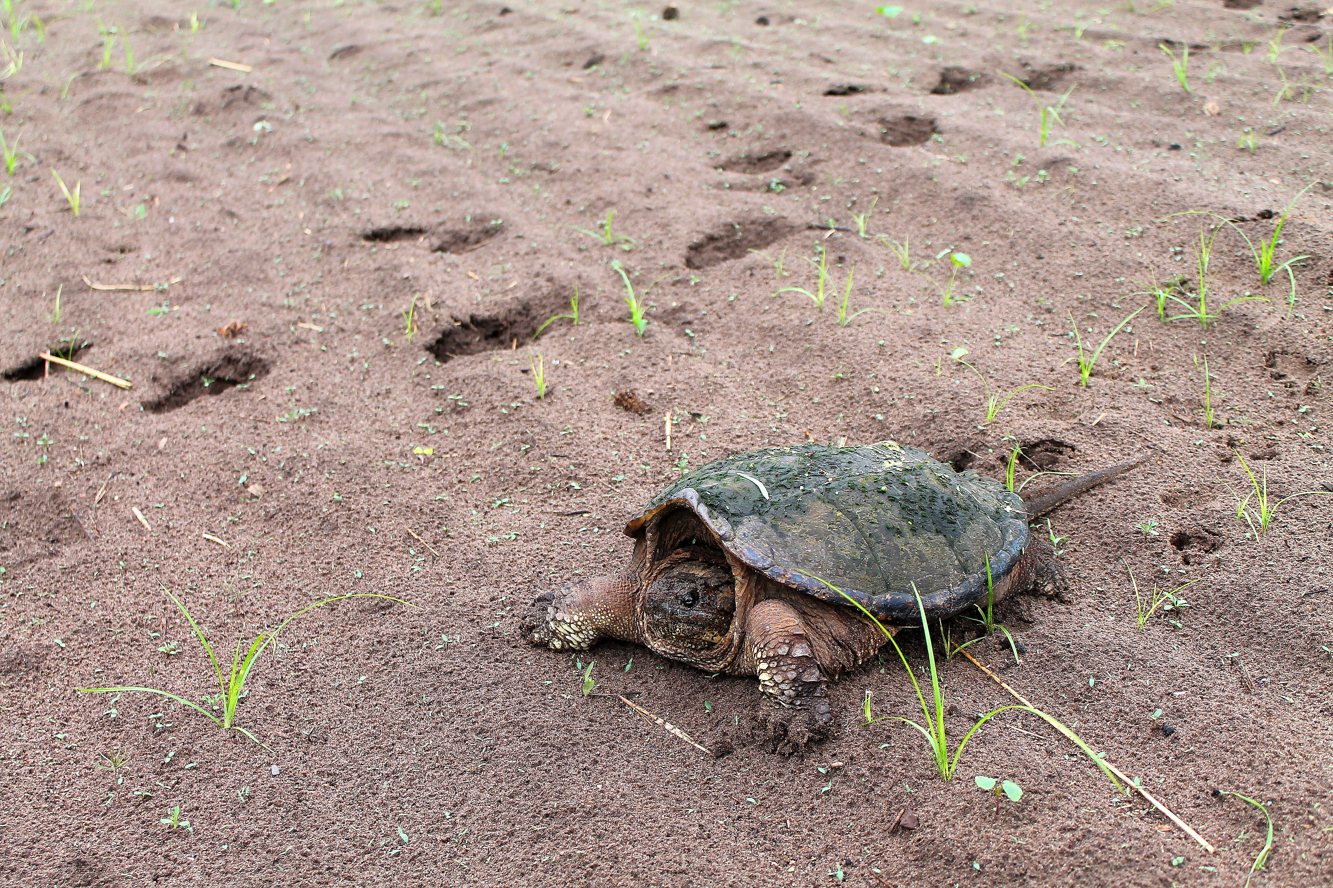 We saw another turtle plodding along in the sandy field, “Make sure you get a picture of her tracks.” Amazing and exciting, I was thrilled! We observed three more backed into nests. It was so awesome to witness. The female turtle digs the nest entirely with their hind legs. She guides each deposited egg into the hole with her hind legs. I walked up to each one, taking a good look at them, totally engrossed by them. It wasn’t my first time seeing a wild snapping turtle, but it was my first time observing their amazing trek out of the water into the sand to dig a nest and lay their eggs. (The turtles I saw hadn’t started depositing eggs yet.) I was somewhat lost in the turtle world while the men continued to talk about the plight of the snapping turtles.