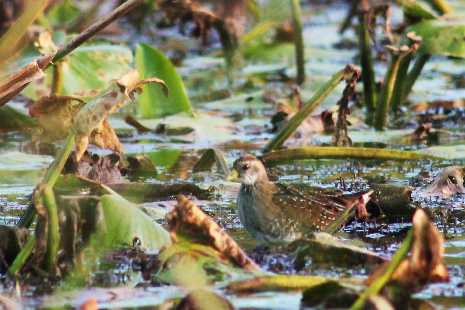 “Rail to your right. Right.” I had trouble spotting it at first, and then there it was sitting among the lily pads – I took it in for a few moments before looking elsewhere. There’s just so much to see and experience, and take in. I was studying the vegetation to my left. There was another sora rail, hopping around, going about its day, finding breakfast. I enjoyed the opportunity and front row seating to watch this lovely bird. It appeared to be catching breakfast, most likely selecting from the mass of insects on the water’s surface. It would dip its beak down and pick something up than lift its head up, presumably eating, then dip its head back down again, turning around, constantly moving. Parts of the bird would sometimes be hidden by the vegetation as it danced about eating breakfast. I was mesmerized by its dance. It may have been eating seeds too. I observed it grab something with its beak. With the sun lighting the bird, I could see its eyes were chocolate brown and not black. I think Larry was watching the rail too.