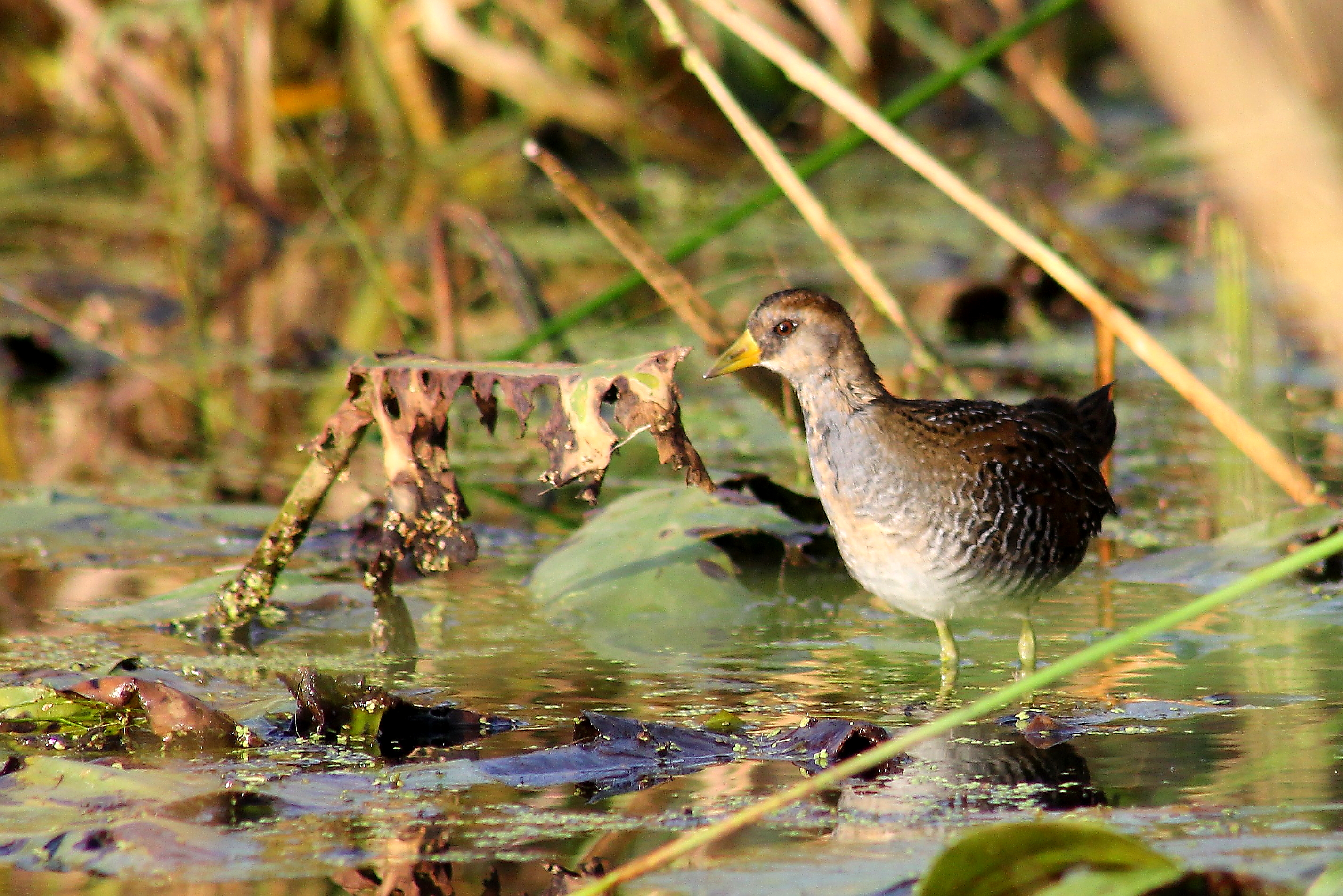 My attention shifted. Behind the rail and several feet away stood another sora rail, facing the other way. This one appeared more slender and sleek and its face wasn’t as dark. The sun hit it just right making its breast, chest, neck, and cheek glow an odd pinkish orange. Its reflection also mirrored in the water. What was it standing on? It turned around and walked in the direction of the other one, which was still minding its own business perched where it had been, and then changed its mind again turning around and heading back the other direction. With the sunlight, it was a beautiful painting in motion. It walked away a little bit but then turned around again, and circled back, changed its mind yet again, turned and walked away. Then the first one followed it. They squabbled a little – seemed silly to be fighting over lily pads with there being so many. Then it seemed like they changed places. A third one entered on to the scene, the first one walked toward it and they also squabbled. It was amusing to watch. We had watched the birds for over ten minutes before Larry turned the canoe around to start making our way back. Hank whined throughout. Larry said, “Isn’t it funny how they fight? – It’s my pad.”