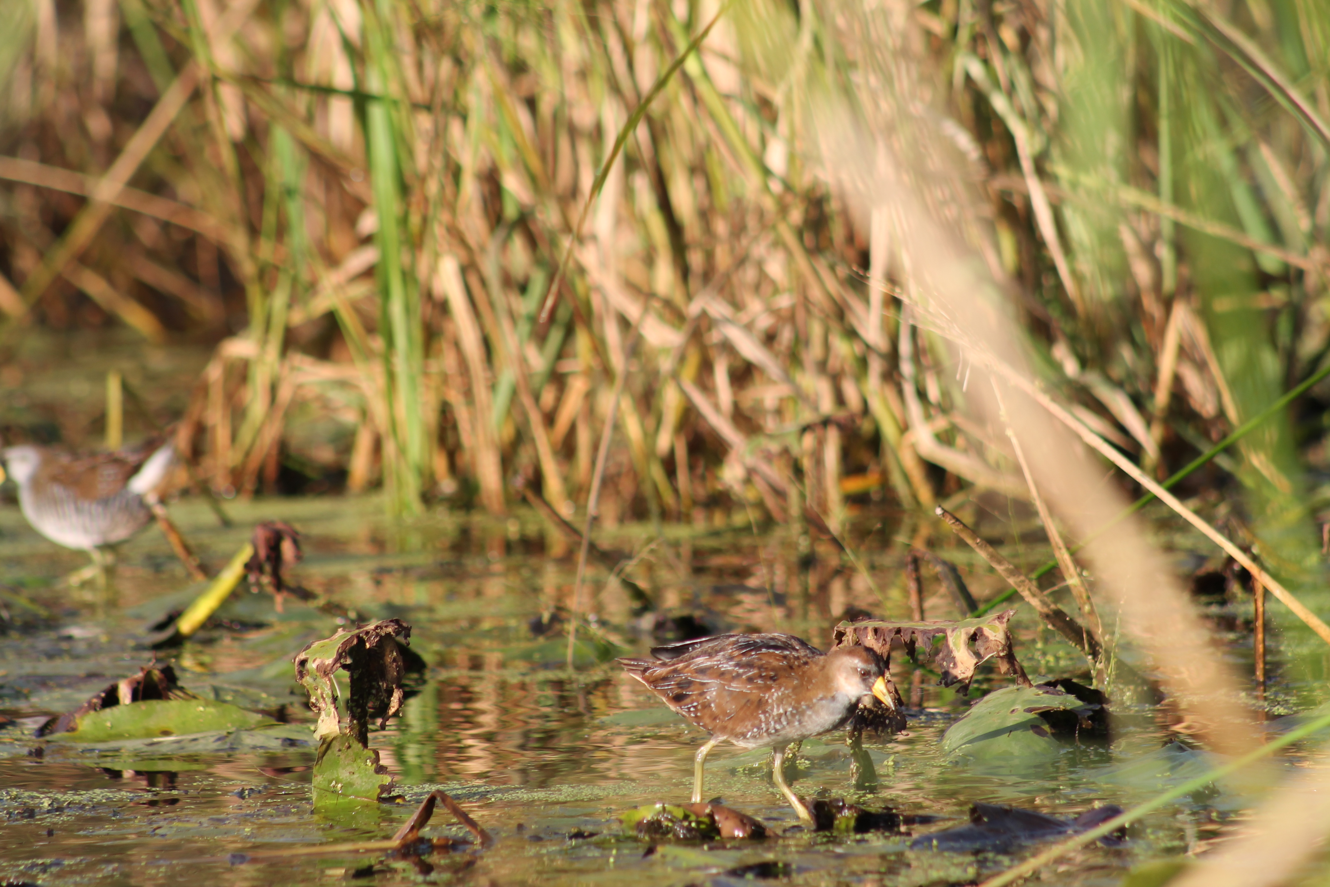 Larry pushed the canoe back through the huge lily patch. I noticed several more sora rails, all near the wild rice plants along the edges. Every time Hank whined, Larry told him to hush. At one point, Larry stopped the canoe, grabbed the paddle and reversed the canoe, for a moment I was confused as to why. The long pole had gotten stuck, leaving Larry’s hands, so he backed up to get it. Larry then put it back in the canoe once he freed it from the vegetation and muck – he then went back to using the paddle. Soon we were through the vast lily patch.