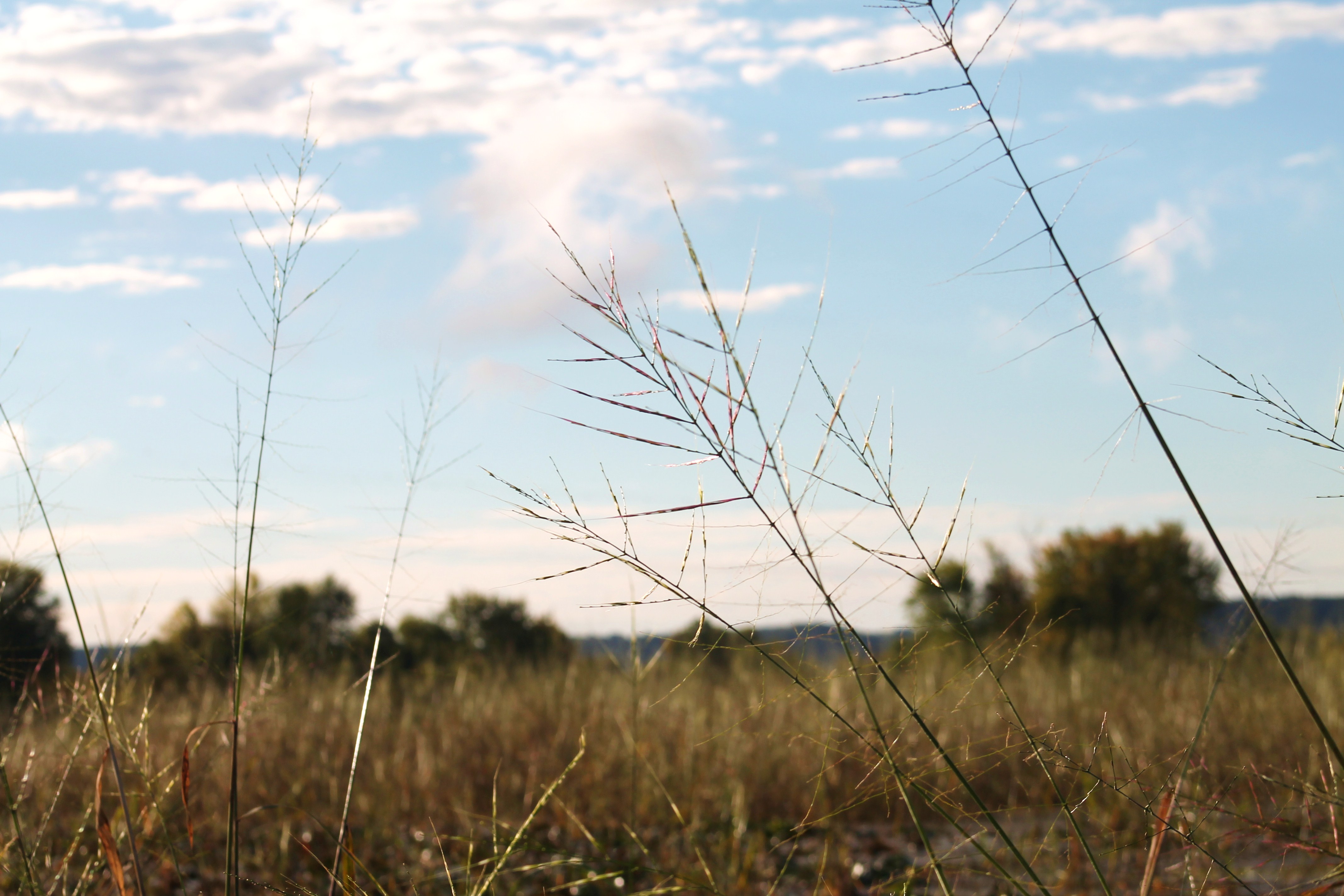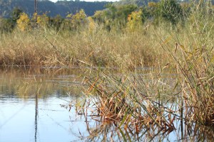 The beauty of the marsh, especially with it poised, ready to launch into fall color, was so healing and refreshing. The dead snags mingled in with the alive and fully clothed trees, lovely, adding to the overall essence of the place. A pair of ducks flew off to our right along with the black birds; I wasn’t able to see what kind they were. The channel had begun to bend slowly to our left, taking us more and more southeast, once the bend was complete we were heading east; startling black birds the whole way, through the wild rice and trees. Cattails started to take over the scene, growing more abundant, especially along the south bank, on our right. – They still looked quite green. I just loved the trees standing tall above us on either side. As we were turning southeast, the bridge came into view. It had been hidden behind the bend. I always feel a little sad when the bridge comes back into view, and we’re heading toward it. Looking to my left, I saw something brown in the water, behind a curtain of wild rice plants – either a beaver or a muskrat but most likely a muskrat. It was just sitting there in the water, running its forepaws through its fur, grooming. My heart leaped. I turned very slightly to get a better look at it but with my movement, it spooked and dived beneath the water. “Was that a beaver or a muskrat?” I asked Larry.