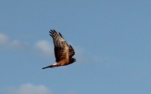 We didn’t follow our previous course completely. Instead of passing on the east side of the island of trees – we glided through a small opening in the wild rice plants to go down the other channel. Flying up out of the water somewhere ahead of us was a marsh hawk, another name for northern harrier. When it came up out of the water it looked like it had something in its talons but it dropped it. I felt bad that we may have been the cause of it dropping its food. I was excited to get a better look at it though. Magnificent bird, I enjoyed watching it soar past. From what I could see of it, it was dark brown with a bright white patch just above its tail feathers with some white on the underside of its wings. Its head was turned our direction when it soared, some distance away and above us, past on our right. Was it looking at us?
