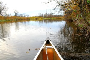 Larry responded for Hank, “I know this place. I like this place; I have fun here!” Hank was indeed eager. Larry backed the truck in towards the landing – nothing more than a worn trail to the water’s edge. When allowed, Hank jumped out of the truck and ran around. Larry climbed into the bed of the truck to unfasten the canoe. Then I grabbed the end of the canoe and slowly walked with it until it was far enough out so that Larry could set the other end on the ground using the rope. He jumped out of the bed of the truck and picked up the other end of it; together we carried it the twelve or so feet to the water’s edge and set it down in the grass. Then Larry moved the truck. The banks of Halfmoon Lake are lined with trees and covered in grass – a diverse plant life. While Larry moved the truck, I took in the beauty of Halfmoon – enclosed and secluded, quiet and peaceful – the naked trees reflecting in the water, along with the patches of blue sky and clouds. Water and trees and quiet, my heart was at home.