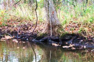 I was extra thrilled about this canoe outing because we were exploring new territory for me and unlike McCarthy, Goose Lake and the Weaver Bottoms, Halfmoon Lake felt more enclosed, not so vast, by its higher banks lined with trees, there wasn’t an empty space beyond those trees, they were like a wall around us – this gave it a more secluded and quiet, peaceful feeling. (I do like the other three places too and so very thankful for the wildlife I’ve seen and photographed in them, however, I think Halfmoon has become my spot, my special place.) As we started off Larry explained, “The water level will start to go down soon.” There was a mass of cattail plants, almost completely yellow brown now with a line of green across them, ahead to our left along the bank. Again, Larry explained, “You can see where the water level had been for a long time on the cattails.” I peered at the cattails more intently, and sure enough, there was a dark line around each stalk (a continuous line across the whole lot) perhaps a foot (hard to gauge from this distance) above the current water level. I was a bit amazed the water had been that much higher – but then again it wasn’t really surprising given all the rain we had that ran off the land into bodies of water. A tree growing on the very edge of a bank had very intriguing roots, reminding me of the tentacles of Ursula, the sea witch from Disney’s The Little Mermaid; however they weren’t sinister in the least. Brown leaves pillowed the ground behind the tree and floated on the water’s surface in front of the tree – bringing to mind a scene from the classic Winnie the Pooh movie; good storytellers draw on experience and observation. The water rippled gently, blurring and distorting the mirrored images of the tree and the vine hanging on to it. The roots that had been under the water were blackened. A green fungus grew in patches on the base of the tree, even going down on to the roots.