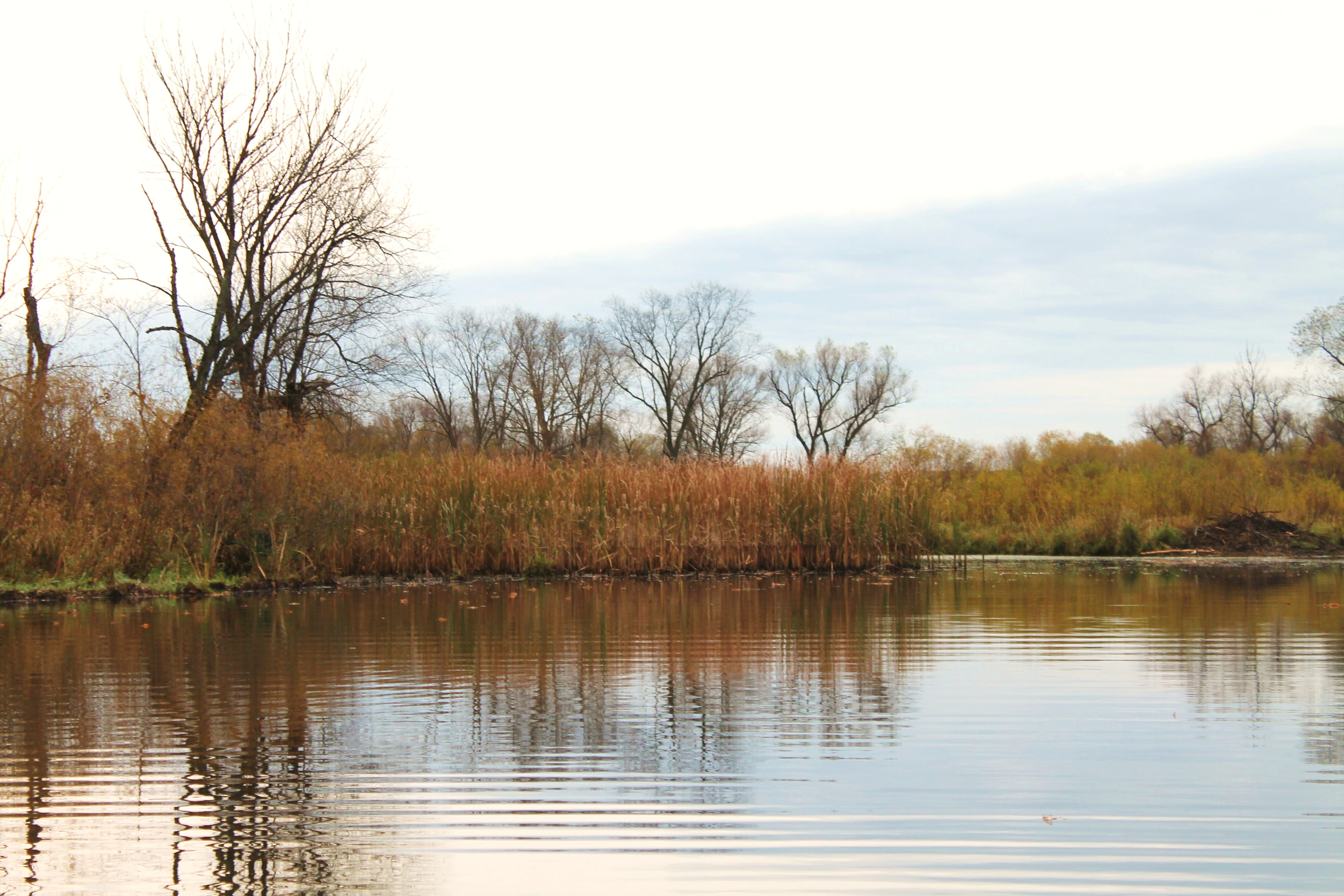 With so much to take in and observe my eyes again shifted to our left, back towards the cattails. Trees looming up behind them were now completely nude, having already dropped all of their leaves. Now each branch is exposed and one can see the form of the tree, a stately beauty and air about them. The cattails seem to come almost to a point, with a handful marching out a little further than the others, a small gap between them. A channel branches off, perpendicular to the “main lake” we were on, the cattail’s point in about a right angle. The channel is narrow. Across the water from the cattails is a good sized beaver lodge, a heaping pile of sticks, strategically placed, packed with mud to hold it together in a dome- like structure. A beaver lodge is always a source of excitement and wonder for me! I am awed by its builders and admire their ingenuity. Wonderstruck by beavers’, merely large rodents, ability to alter a habitat; there is so much diversity and life in beaver ponds and meadows.