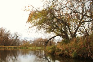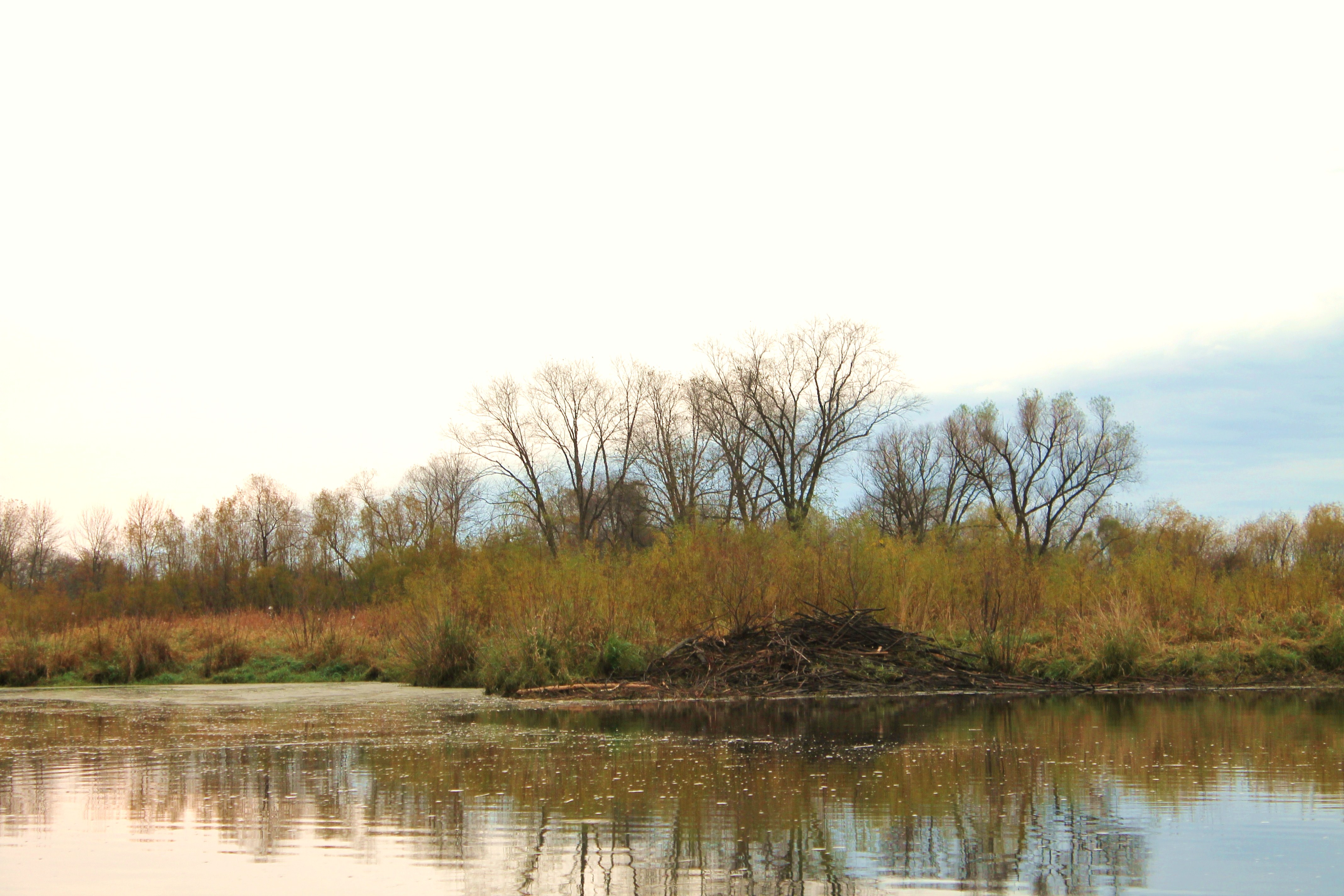 The channel curved lazily to the left again. The water reflected the trees by broad brush strokes of color. Situated up against the right bank ahead, rose a large beaver lodge. My excitement from spotting it was like that of a child, filled with awe and thrilled that beavers were inside at this very moment. Small trees set ablaze like a climbing fire, rose up on the bank behind the lodge. Most of the trees in the woodlands behind and ahead of the lodge were still dressed in their autumn finery – orange, russet, and yellow green. However, the trees on the left bank had shed their autumn clothes and now stood naked, each individual branch now clearly seen. The grass was still green though the other plants growing along the water’s edge had turned brown. Only a few leaves hung on here and there. There were some much smaller trees still holding on to their leaves, fading from green to yellow.