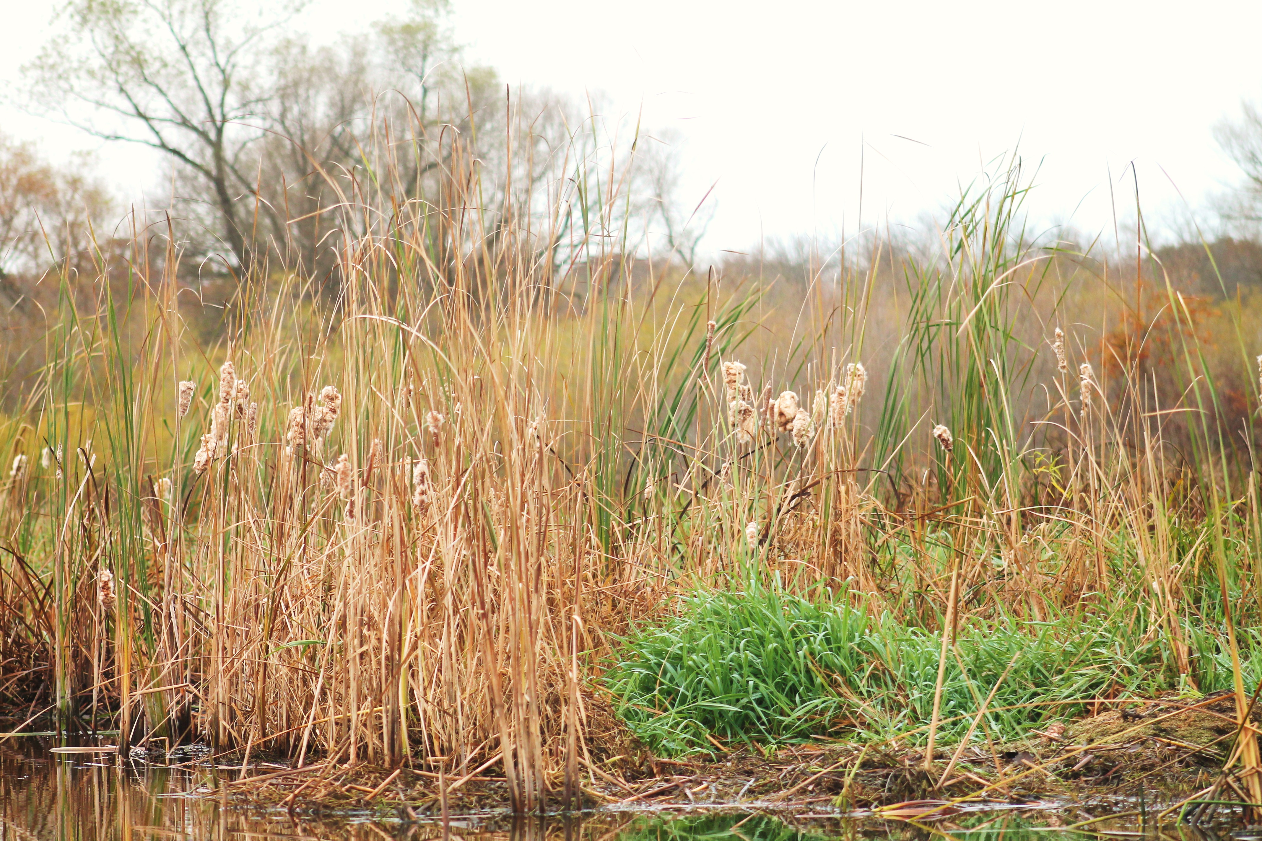 On our right, a glorious willow tree stood upon the bank where the “lake” went around a bend. That willow spoke to my heart – I just wanted to climb up on to one of its branches and nestle against it. I loved that tree and desired very much to spend time with it, get to know it. It wasn’t just its beauty and loveliness though there was that too, but its character. What wisdom and stories would it impart if it could speak? It reached out a large limb over the water, an arm extended, hand held out over the water, fingers stretched trying to touch it, one branch succeed in stirring the water with dead vegetation clinging and wrapped around its tip. I was so focused on the eagle’s nest and fantastic willow tree I almost missed the great blue heron that had been in the water in the bend just beyond the willow tree. It burst out of the water with a cry and flew across the way – its voice a reminder of the wild, a stirring in my heart that there is still such a thing as wild. Though we only got a glimpse of it, I was elated at the sighting, cheered just to know it was here. On the bank across the water were clumps of young trees still clothed with leaves, smudges of green and yellow from an impressionist’s brush. Larry gracefully paddled the canoe into the bend. We were closer to the eagle’s nest; built with sticks and mud, even bigger than it appeared from our position; it was a thing of wonder, almost mystical. If we returned here in March we’d probably see at least one large, majestic bird sitting in it – white head feathers a striking contrast to the still barren trees. Again so much to look at, my eyes were drawn to the cattails on our right. The brown, cylindrical seed head had exploded into a light brown white fluffy cotton ball on all of the cattail plants. Some long green grass grew among the cattails.