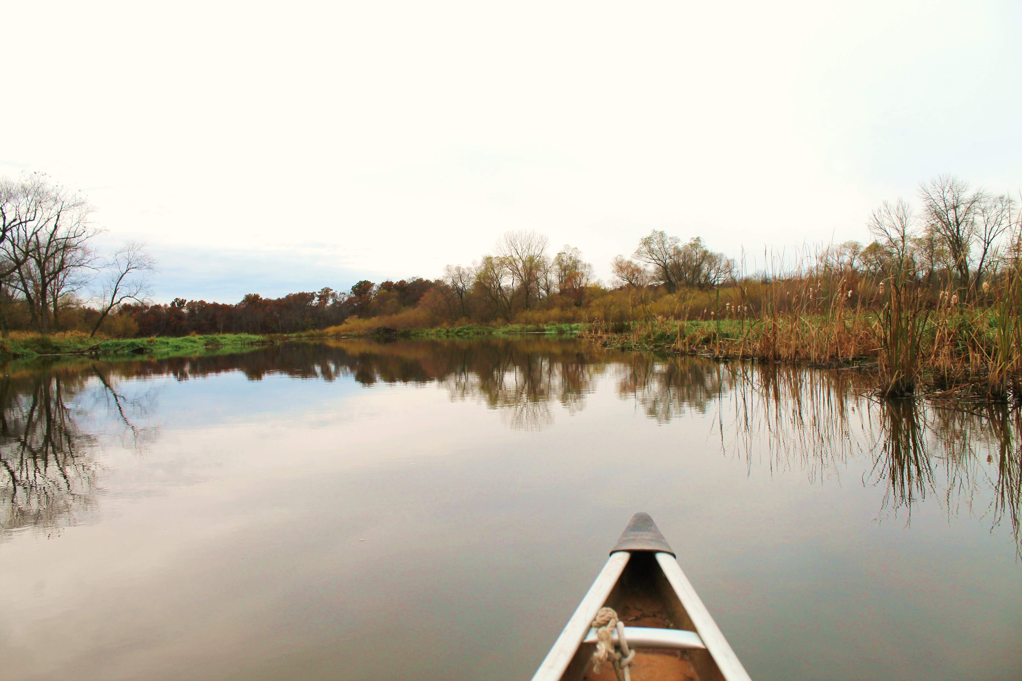 A tree loomed up out of the water beside it. The “lake” went around a bend ahead of us. Across the way, sat an eagle’s nest braced among thick branches of a tall tree. The tree’s trunk wasn’t straight, but rather leaned to one side, giving the appearance it was leaning due to the great weight of the nest. It grew on the edge of a forest, covering an island. A few oak trees clung to the remainder of their russet leaves behind it. Just beyond the mound that the beaver lodge stood against was another channel splitting off from the main body, grassy islands on either side and in the middle, the channel split to the right and a very narrow one going to the left. Ahead of it was trees all the way across – only the oak trees had some leaves remaining. There was a blue sign with a canoe marking a state canoe trail. Of course, I wanted to go exploring down that channel too but it wasn’t our course for the day. Past the channel the bank was covered with green grass, trees behind, cattails, and more signs.