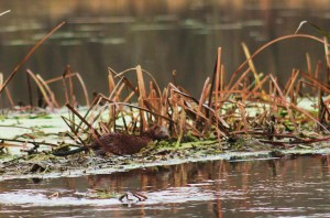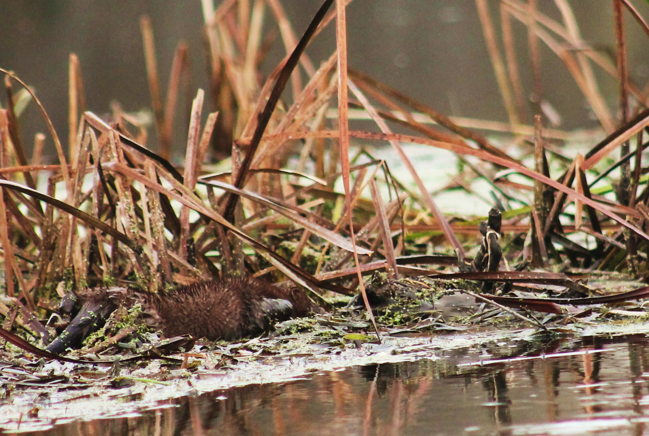 The vegetation on the right opened up to another large pond. I was taking in the vegetation when suddenly I noticed a little critter sitting there. Its dark brown coat blended in with the brown cattails. “Look!”