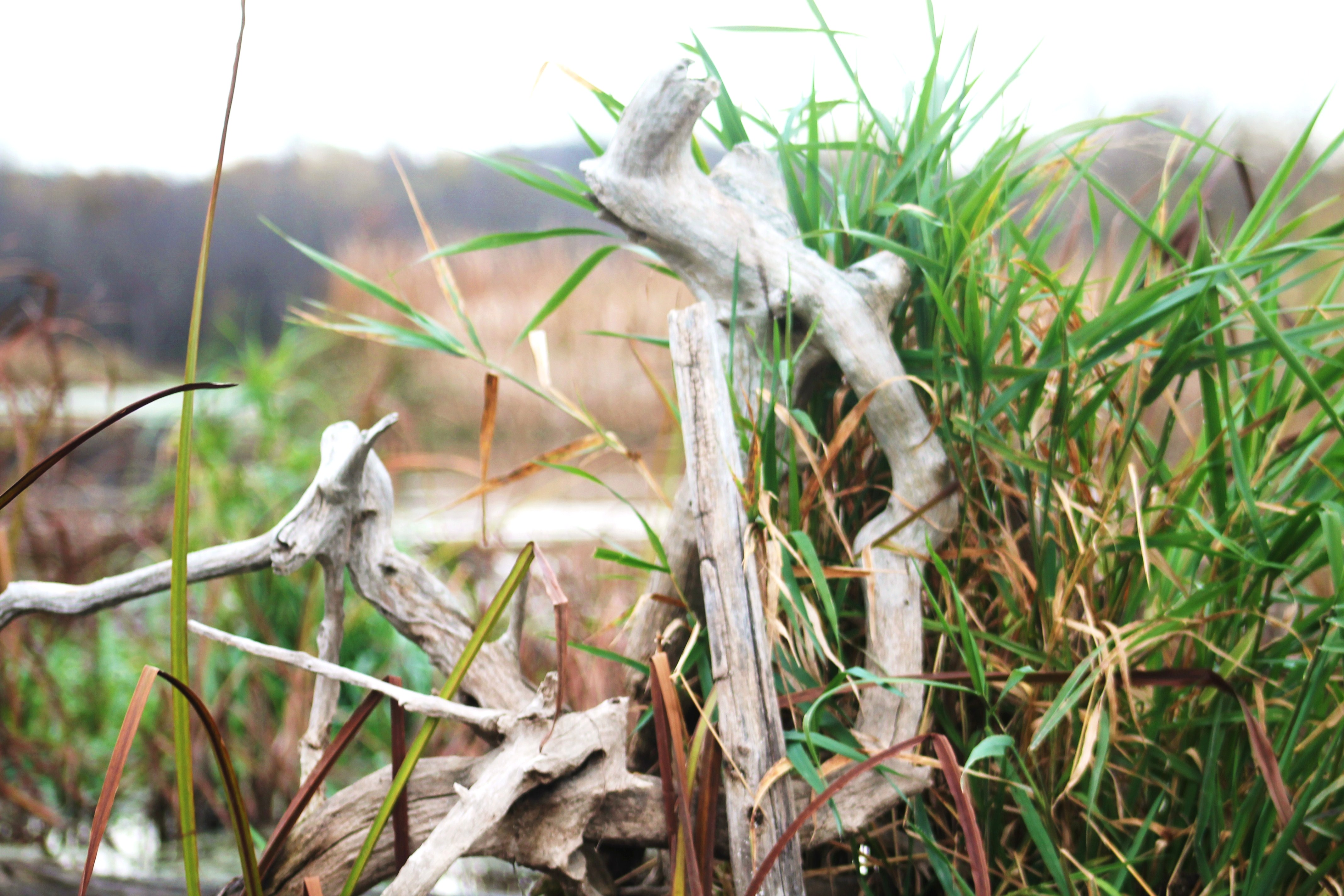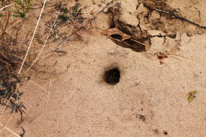 We continued walking. Hank ran ahead, finding sticks he hoped Larry would throw. – If he wasn’t carting a stick around, he had his nose to the ground sniffing everything. His nonstop energy never ceases to amaze and at times amuses us. We came along a bare spot – I am still awed that the soil here is completely sand, not sandy loam but sand, like on a beach. An almost perfectly round hole in the sand caught my attention, perhaps it belonged to a small rodent. Larry came to look at the hole but didn’t linger, again I had to walk fast to keep up with him. There were tufts of grass breaking up the bare patches but the sand was still quite visible. A dead cedar tree lay on the ground – just the trunk and bare branches sticking out from it at odd angles, it was only a skeleton of the former tree but oh, ever so lovely, something about its shape, texture, and contrast intrigued me. The little bluestem also caught my attention, who knew grass could be so beautiful, amber and elegant stems contrasting nicely with fuzzy white seed heads on the tip. Another branch lying on the ground looked like an antler after the felt is all rubbed off. The grasses and other plants filled in, covering the sand again.