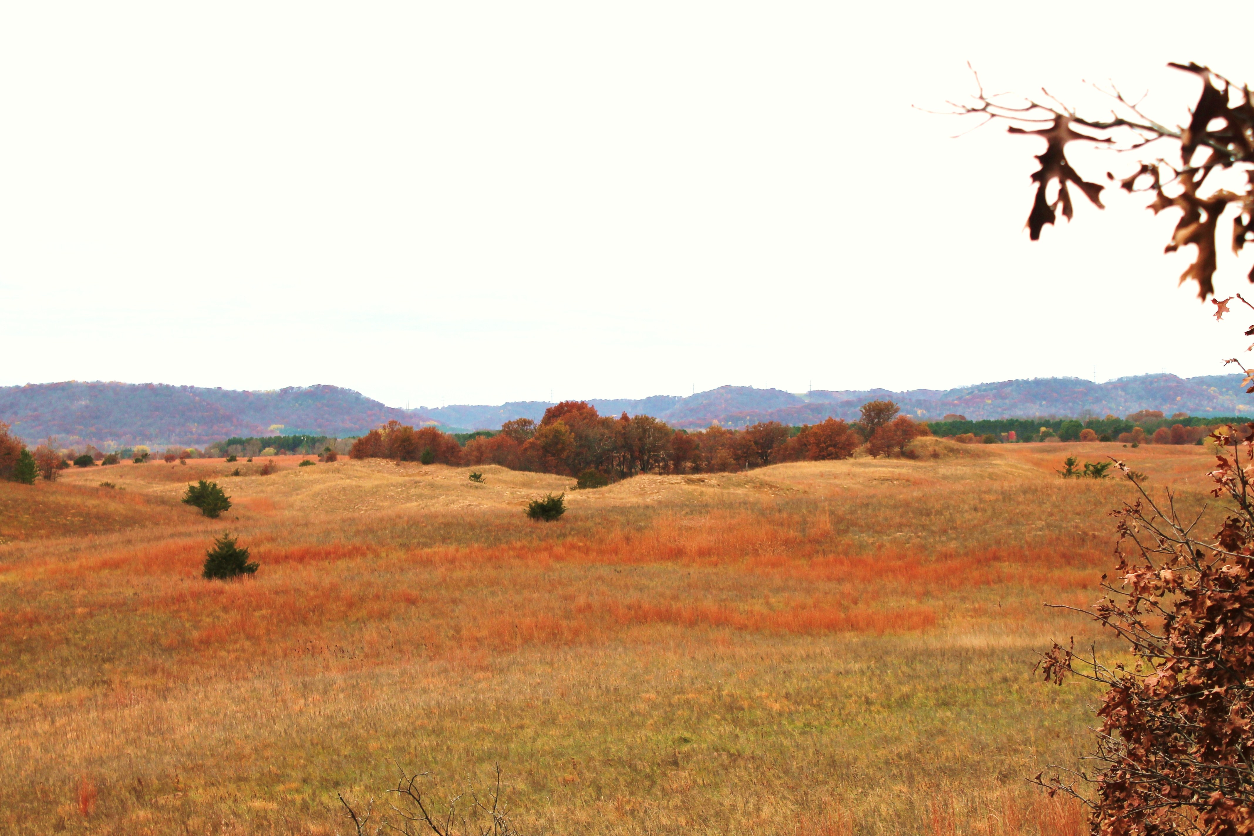 The prairie was about as colorful as its neighboring woodlands, though not as bright; swaths of pale green, dark orange flames, soft gray, sandy white/brown of the dying prairie plants; beautiful in its own unique way. As we stepped out on to the prairie, going a little toward our left, I enjoyed studying a couple prairie plants in turn. One orange and fluid, like dancing flames. One with long, skinny, wood stems that were red orange had a shrub like appearance. Oblong leaves, almost in star like formation, of a mint close to the ground were still green. Wispy thin stems, brown bowed and bent prairie grasses going dormant. I’d have to almost run to catch up with Larry. We were staying on the fringes of the prairie.