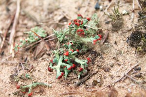 On top of a dune, Larry halted and sat down. I took a few photos and then sat down to join him. Larry had chosen a spot to sit such that we could view the prairie. We were sitting next to a fascinating fungus, green tubules branching off every which way, topped with a bright red cap. I remarked to Larry, “I like the solider fungus.”