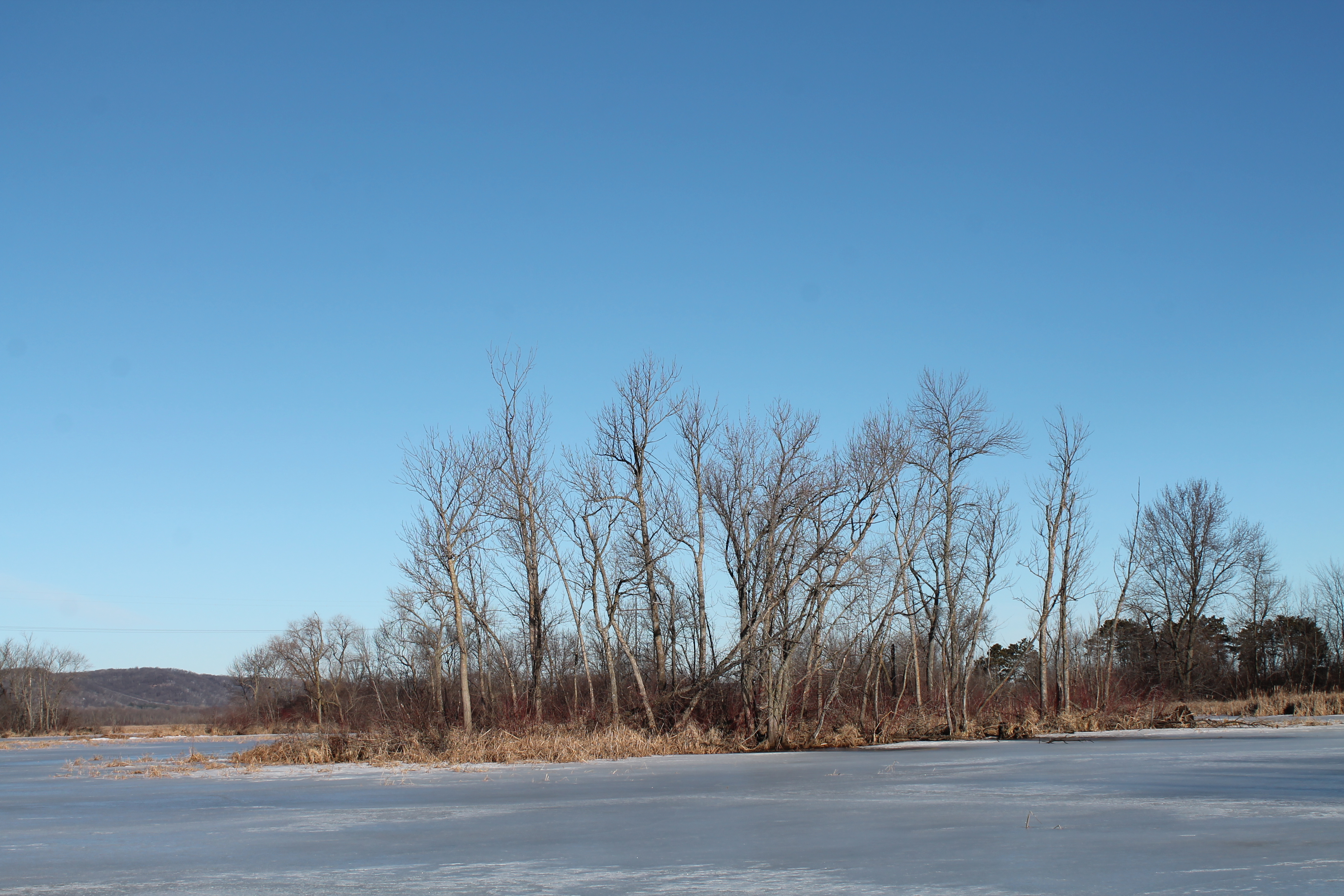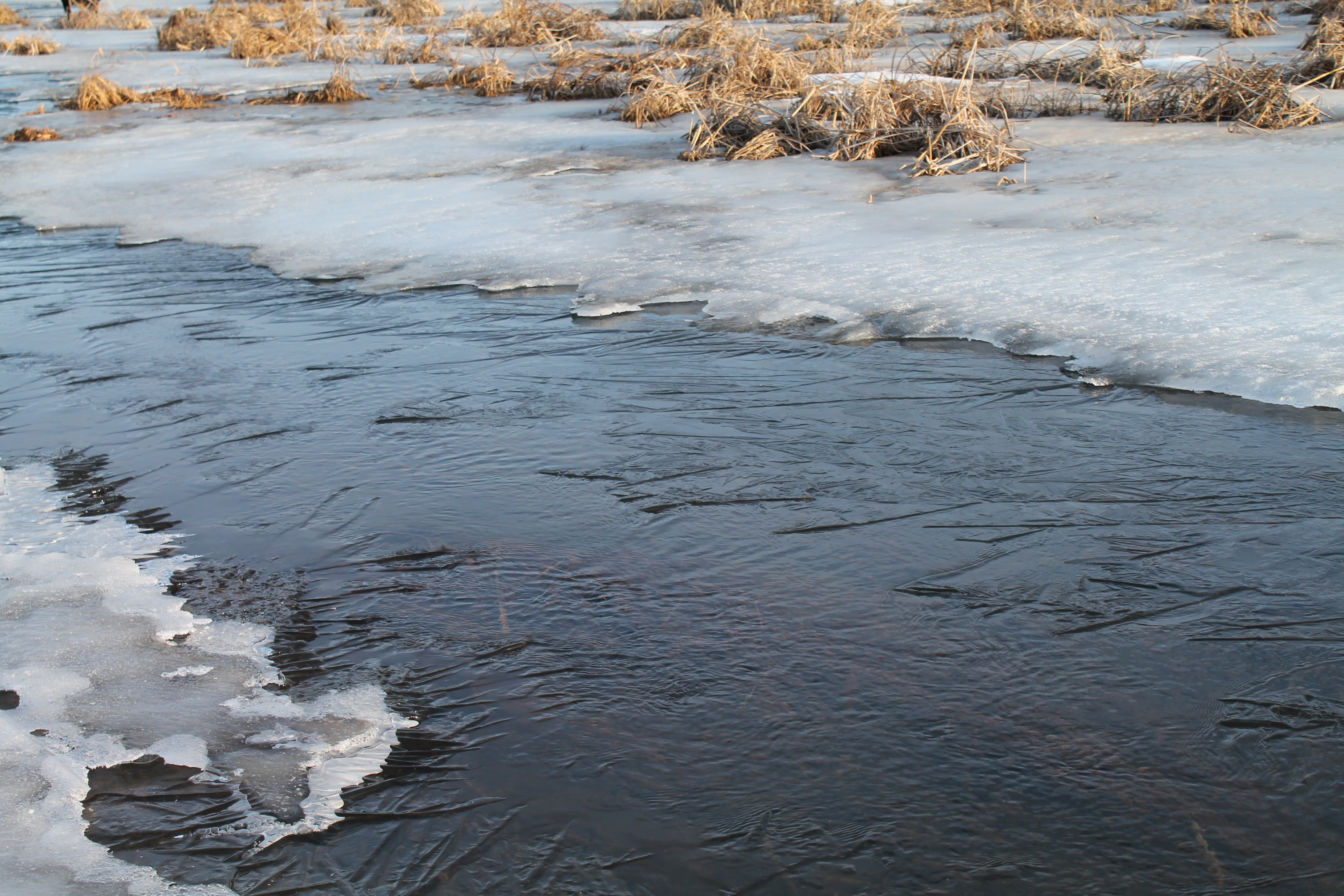 “That’s where we are?” I hadn’t recognized the place because we came out to the prairie from the opposite direction. We then entered the wooded area again. Hank found sticks and begged Larry to throw them, which he did a few times. Larry went along the bank trying to find a good place to get back on the ice. He then took us southeast. We walked out from the trees and among the rushes again, leaving behind firm ground, returning to the ice. Again, I stayed close behind Larry as I could, paying more attention to where he placed his feet than to the landscape around us. Even then it was hard to know exactly where he placed his feet in the tangle of rushes. We headed westward at first to rejoin the channel. Then we were through the rushes and headed southward back the way we came. Larry put his arm around my shoulder and asked, “How’s your foot feeling? Cold?”