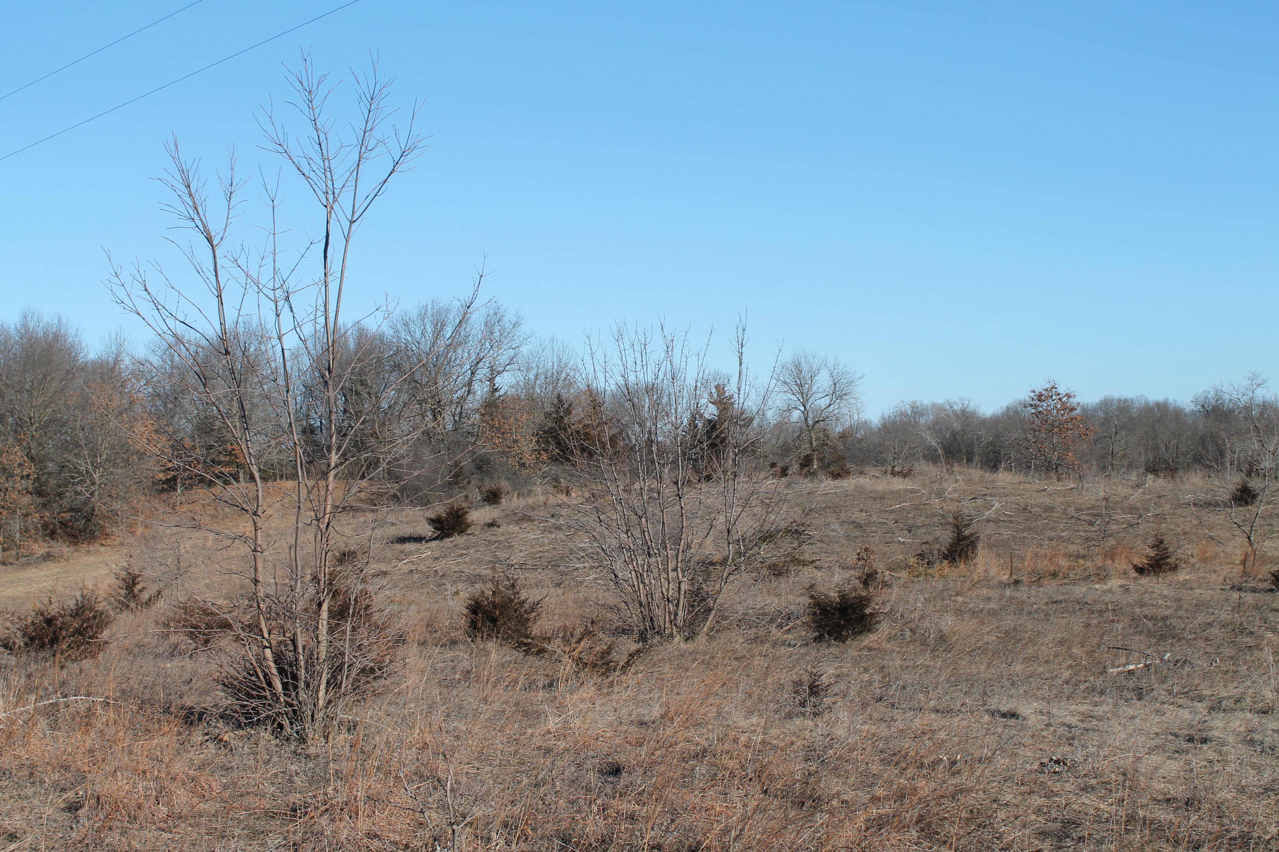 It was a very short rest, in five minutes we were up and walking again. There were remainders on the hill side of cedar trees that had grown here but that were cut down by the TNC a few years ago, now just skeletal remains bleached white. Leaves from the oak trees littered the ground, nestling into the grass. We’d come far enough away from our pocket between the knolls that we were back in the chilling wind. We turned southwestward, climbing a slight incline around the end of the knoll. On higher ground, completely out in the open the wind really hit us. The prairie before us looked desolate. Other than the cedars here and there, everything was a variation of gray and brown. Even the short scrubby sumac, though brilliant in autumn, lent to the feeling of it being desolate with its bare gray branches reaching out every which way, gnawed on by deer. The golden patches of little bluestem growing here and there offered the only bright, vibrant color. We veered southward and into a stand of trees encroaching on the prairie. It was a little warmer in the trees; they slowed the wind and yet didn’t block out the sunlight that came filtering through. We walked in a fire break, about as wide as a car; it had been mowed and cleared, and any trees that had been growing in it had been cut down close to the ground and removed.