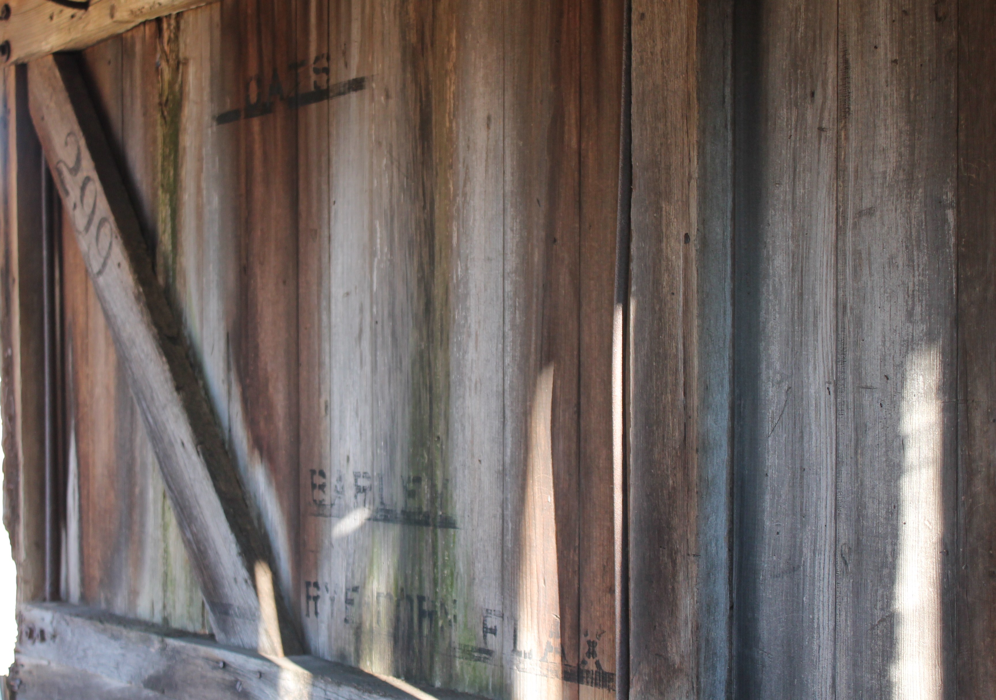 Larry gave another reason for why he thought this was an old box car, looking on the inside, “There are marks on the wall for barley, oats, and rye.” I looked inside the window and was fascinated to see what he was talking about. Written on the wall at three different heights, each with a solid black line under it was: RYE CORN FLAX on the bottom, just above it BARLEY and far above that, nearly touching the ceiling, OATS.