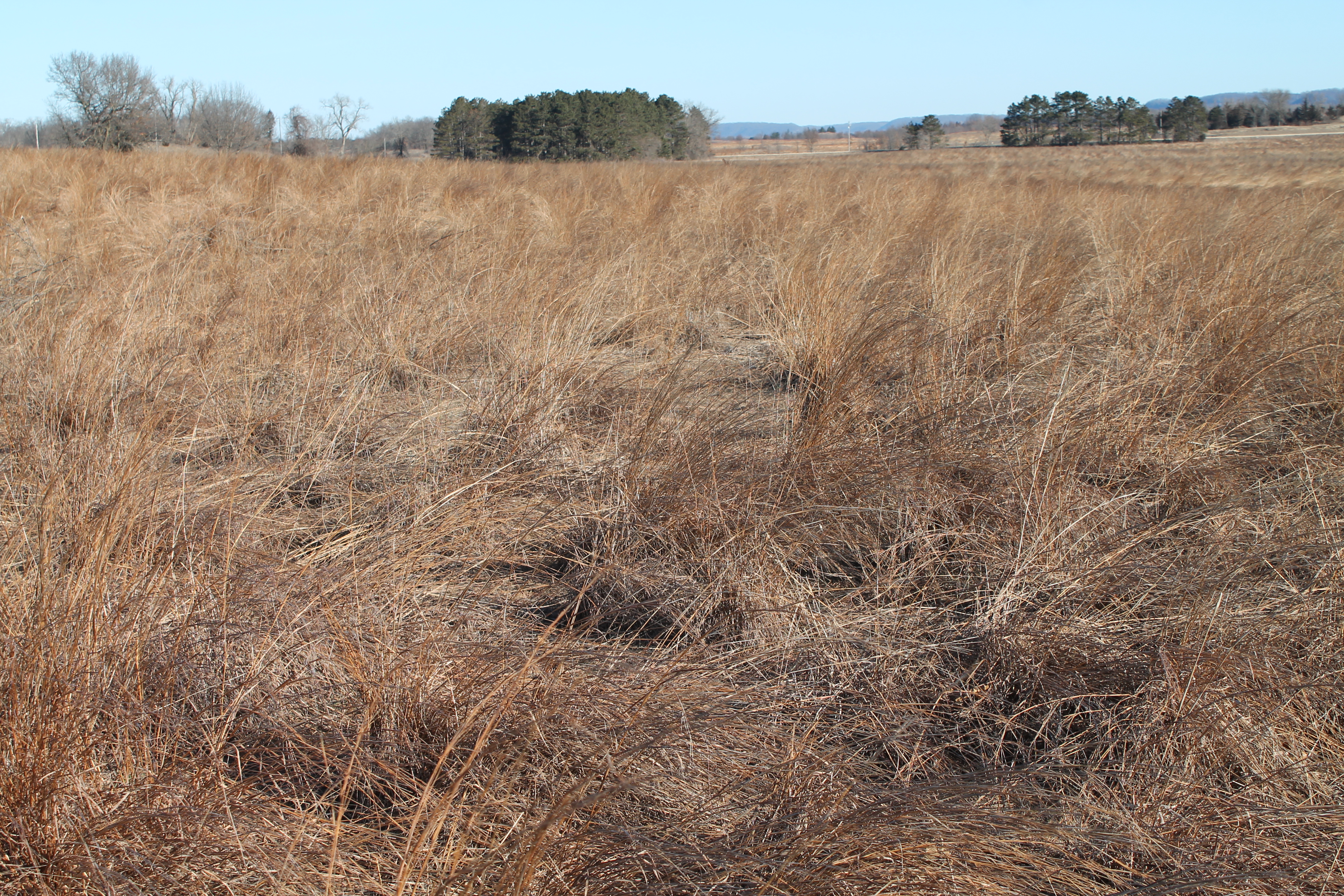 We went down a small incline passed through trees on either side of us; there was a patch of short scrubby trees. I looked back again and could make out the stone wall through the trees. Hank meandered about always looking for a stick to play with. There was a clump of pine trees on our left, we were facing east. The prairie opened up before us. There was a fire break mowed around it. Then a sea of little bluestem, stretching to the road on the north, the former farm site to the west, far to the south a row of trees and Goose Lake beyond. The trees continued in almost an oval shape around to the east as did the water. We waded through the little bluestem, the loose sand beneath made the walking difficult as my feet slipped and slid. We continued eastward. It didn’t feel quite so cold with the wind at our backs and the strenuous trek through the little bluestem. Soon we were on the edge of the trees.