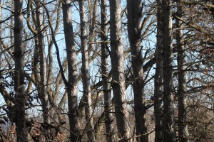 I enjoyed walking through the trees. I noticed a spot where there was some ice, had the water come up this far? I saw another fascinating river birch; it had three trunks, separating almost as soon as it came out of the ground. It almost looked like three giant fingers popping out of the ground. I admired yet another river birch, its many trunks quite serpentine. We had come close to the corner of the lake, where the west and north banks met. Larry paused behind a tree and indicated the birds in the water; we weren’t very close to the water’s edge though Hank was.