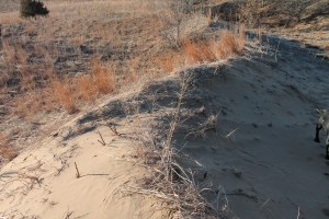 We came to a much bigger depression between dunes, more like a valley than a pocket. It was filled with short little sumac, growing in a thick patch, grazed heavily by the deer. There were a few short, rounded cedar trees along the edges of the sumac and a few milk weed plants. We passed through the sumac and climbed up the next dune – again stopping for just a moment to admire the view. The rolling dunes ahead seemed to match the shape of the distant bluffs, only much smaller in scale. The sight was incredibly beautiful. We followed along the ridge to an active sand dune (We’d turned to our left again, heading westward), the soft sand was mostly exposed, very little vegetation grew on it, clumps of grass here and there. It was like a sand dune on a beach, reminding me of a scene from Anne of Green Gables when she’s walking along the shore. I had the urge to lie down on the sand, to feel it, let it run through my fingers. The grain was quite fine, making me think it is a soft sand rather than a course sand. Larry talked about the active sand dunes before we moved on. He also said, indicating a little further west, “This is a good spot to see pasque flowers in bloom.” I have yet to see a pasque flower but I hoped I’d see one in the coming weeks.