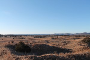 It started out as gentle inclines but the further we walked the larger the dunes became. There was a wall of trees to the left and right of us and behind us but it was completely open ahead of us. Ahead, far off in the distance were bluffs, hemming in the prairie. We veered to our left. It didn’t take long before I was winded and breathing heavily – I guess I need to walk more, especially uphill. Up and down and back up we went, again and again. There were a few trees here and there dotting the prairie, tiny oak, cedars and pine trees. Many of the little pine trees had been cut down, lying in little piles here and there. Larry explained they were being cut to keep the trees from taking over.