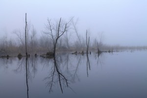 We didn’t return the same way, we took the other channel; it was deeper. The trees on our right seemed to rise out of nothing, the edge of the world – everything beyond shrouded in gray. I reveled in the beauty of the pencil drawn trees and their images mirrored in the channel. We seemed to be canoeing into nothingness as well – like we were sailing on the Dawn Treader, nearing the world’s edge. The pale yellow orb was also reflected in the water.