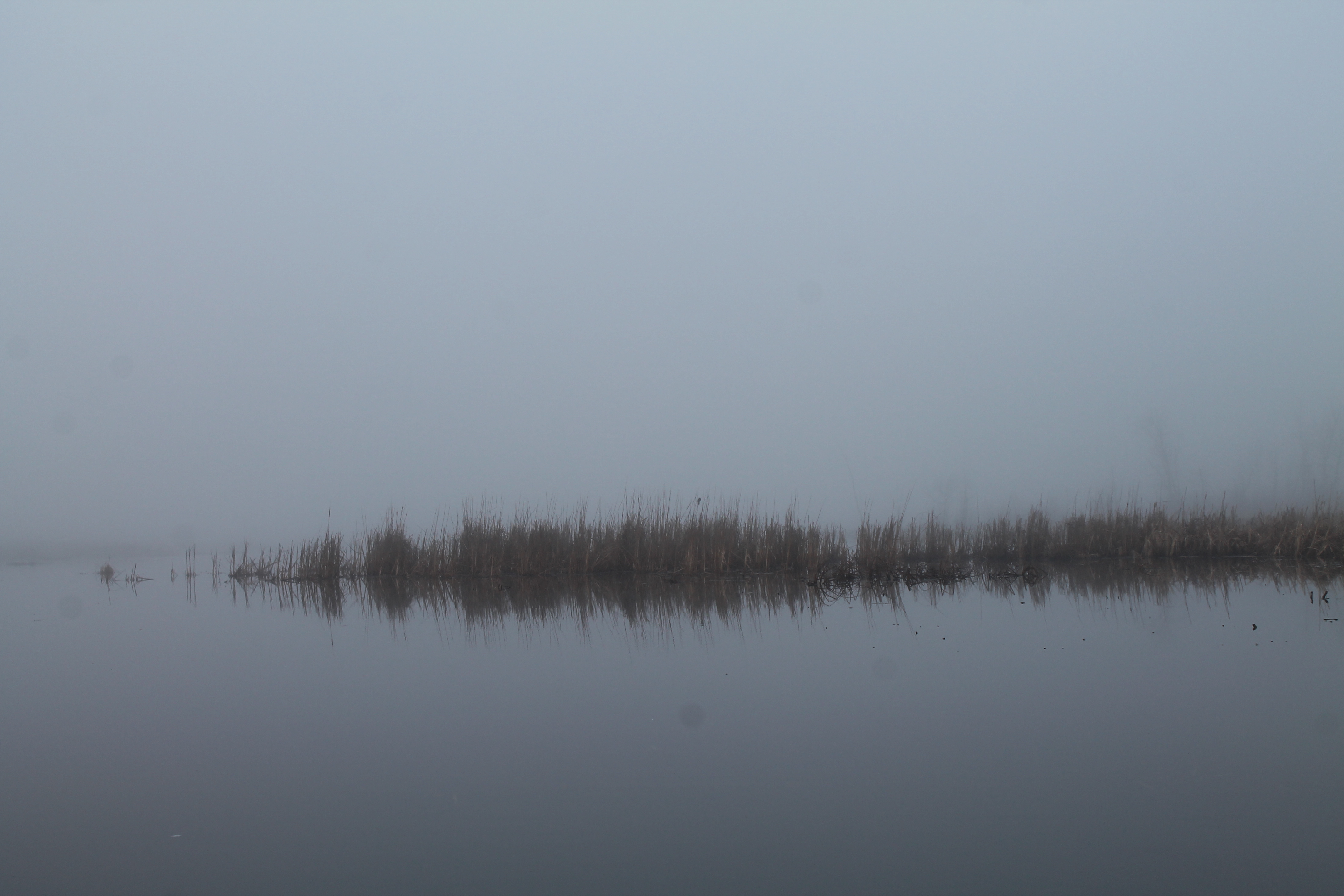 The base of a tree on our right had been stripped of bark, grooved with teeth marks. We had entered beaver territory. There were so many beaver scent mounds! I admired the way a tree hung out over the water and the loveliness of its reflection. Last year the scent mounds were mostly near the bridge and there weren’t quite nearly as many. But as we continued down Schmoker’s they seemed to line the channel on either side. There were so many mounds one could almost imagine you could smell the castor as we passed, and perhaps we could. Larry joked, “This is a mound building tribe of beavers!” Indeed! Many trees had been chewed on by beavers. I was delighted to see the beaver signs and by the thought that one could be nearby. As we passed the lodge, I hoped we’d see one but they didn’t make an appearance. I admired the trees along the bank to our left as we went down the channel. The fog was still thick – making it hard to pick out all the landmarks.