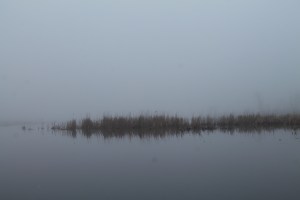 The fog was quite thick, but despite the foggy morning and the temperature around twenty eight degrees, Larry and I decided we’d take the canoe out. We thought the fog would burn off quickly since the sun was shining brightly but it didn’t burn off until 10:30 am or so. We put the canoe in on McCarthy just off the bridge around 8:00 am. We brought Hank with us. Larry paddled the canoe up McCarthy following our route from last fall. Ducks flew away as we drew near; Larry identified mallards, buffleheads, ring necks, northern shovelers and teal. Canada geese squawked noisily when we drew close to them. The fog was so thick we had very little visibility; we couldn’t see anything beyond the trees lining the water on either side. The trees themselves were nothing more than just faint pencil drawings. Though too foggy to take pictures of the birds (the camera wasn’t focusing) it was quite lovely and mystical. The fog isolated us from everything else, compounding the feeling of serenity canoeing brings. I enjoyed our solitude. The fog seemed to enhance the bird calls; since we couldn’t see them very well, my hearing stepped up a notch – maybe the fog was trapping in the sound. Larry spotted a kingfisher; I didn’t see it but only heard it. The beauty of the water and the trees in the fog was breathtaking, but my head and eyes began to hurt from the strain of trying to see through the fog.