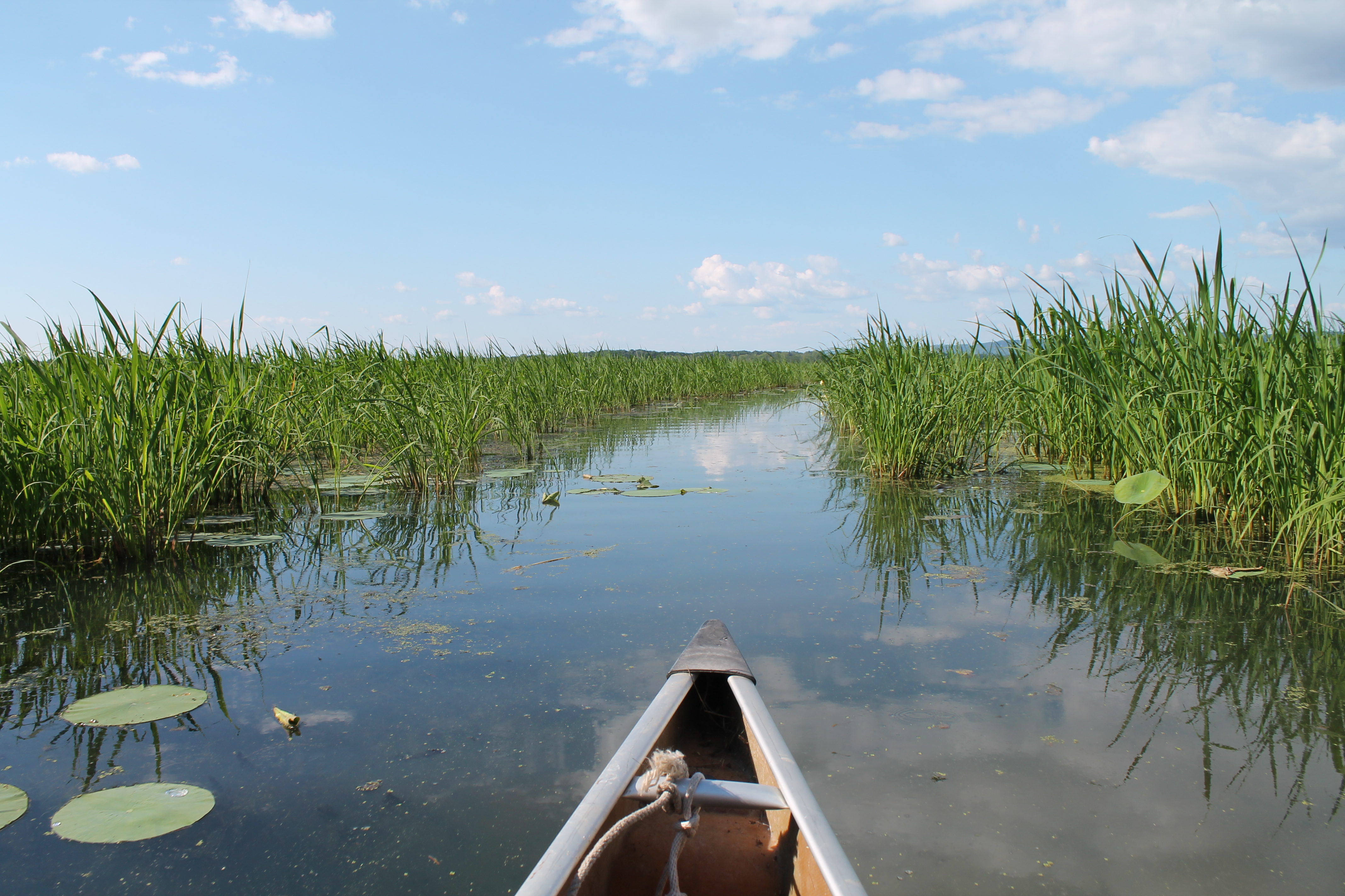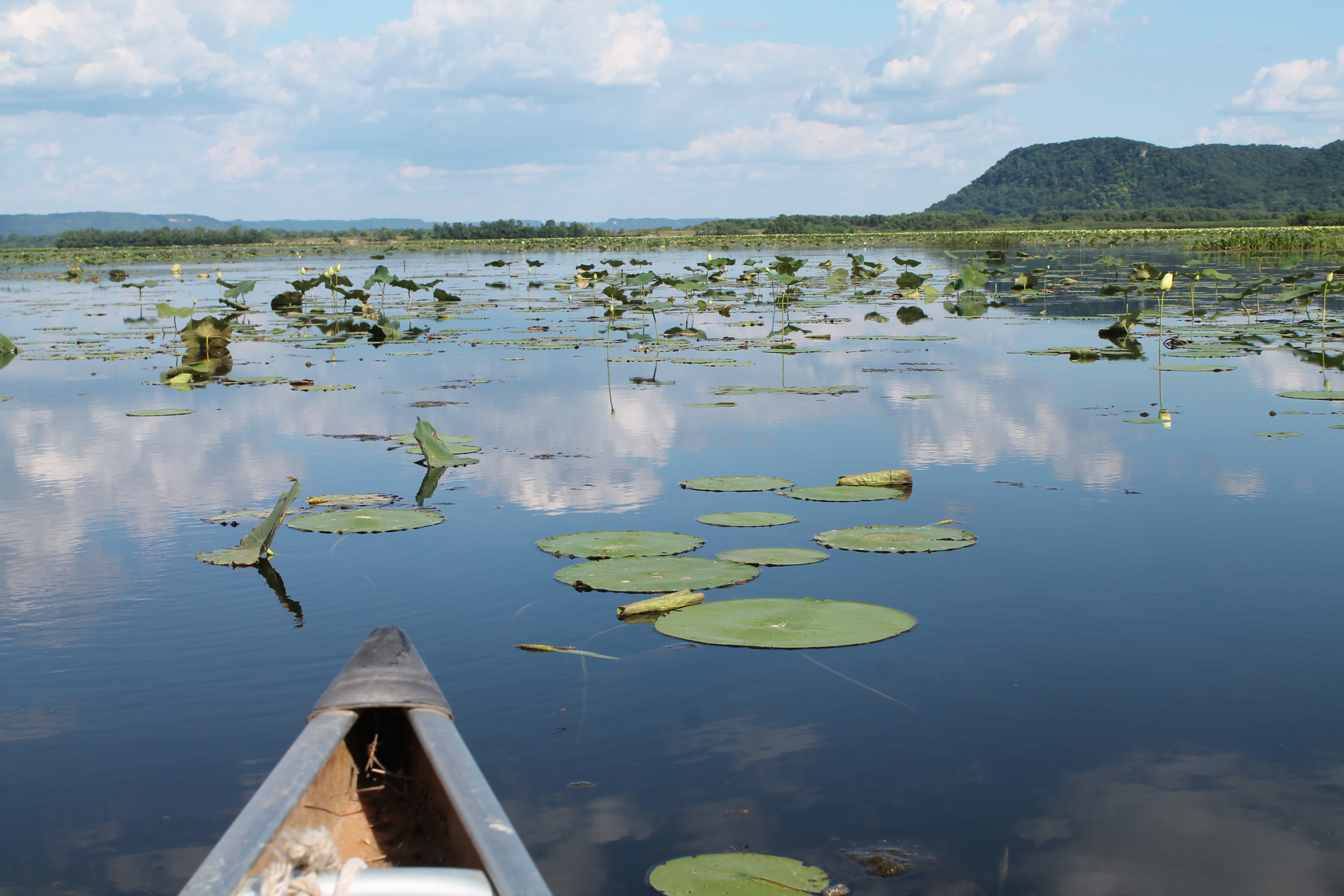 I was elated to be heading out in the canoe once more. The day wasn’t so hot that sitting in the sun was extremely uncomfortable but it was still warm – in fact it was the perfect temperature, with only the slightest breeze. The water near the boat landing was thick with vegetation on all sides, brilliantly green; cattails, rushes, sedges, sagittaria and yellow lotus. It feels magical floating through these aquatic plants. Larry guided us along the boat path going through the lush, aquatic meadow. There weren’t many lotus plants and only a few in bloom. The color and smooth texture of the lotus blossom brought to mind a bridal dress. We were canoeing in roughly the same place and general direction we had last July. The plants above the surface began to thin dramatically while I think those beneath the water had thickened; mostly a tangled morass of coonstail, barring any glimpse of the watery world beneath them. A little further on, the canoe slid through a field of water lily pads. The pads were storybook; I almost expected to see a frog sitting on one, pleading with me to take it in and feed it and offer a warm bed to it. No frogs in sight, even though there are leopard frogs living in the Weaver Bottoms. Frogs are awesome, so I would have loved to see even one. In a moment, we were out of the lilies.
