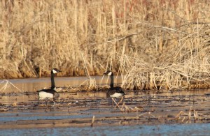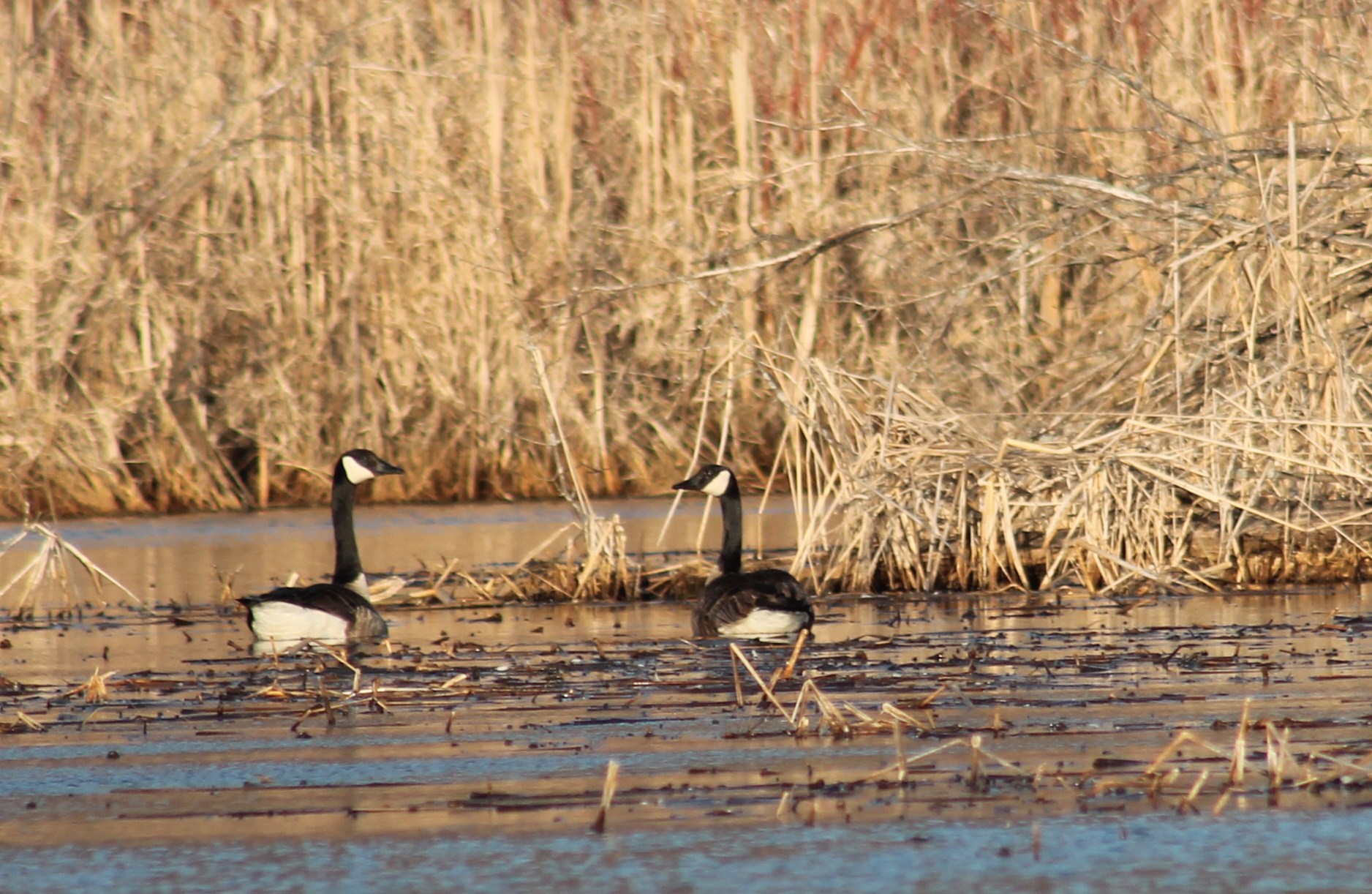 The first birds to engage my attention was a pair of Canada geese swimming elegantly in the water on the left. We were just close enough to them to make them aware of our presence, making them edgy, watchful and vocal but not enough to frighten them away. Another pair was far less visible and almost unnoticed on a mound of vegetation and snags. They were both sitting. Could they be nesting already? Canada geese are some of the loudest birds I have encountered in the marshes. Sandhill cranes may rival them in loudness and yet seem not as noisy.