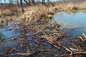 I laughed a little at that, beavers are so determined. A moment later, “Looks like a scent mound.” A pile of dirt mingled with dead rushes, a mini mountain. It looked fresh. It was exciting to see several signs of beavers.