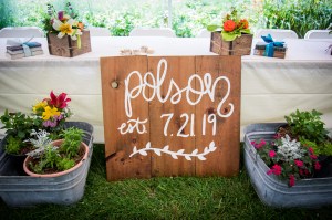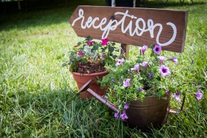 But despite people telling us an outdoor wedding in Minnesota is a bad idea, either it’s too hot or too cold, buggy or rainy, or a combination therein – I had decided a couple of years ago, yes, before he proposed, that I wanted an outdoor wedding on the farm. It is so us – we began dating on a hay bale still in the field; we spend most of our time outside, and we’re both farmers. Plus doing it on Mom’s farm provided a more intimate, private and special location. However, two farmers getting married on the farm did not mean redneck. Oh no, though farmers, Jesse and I are classy – not redneck, hick, hillybilly, or country bumpkins, rather farming intellectuals with taste. I wanted a gorgeous wedding, it had to look and feel bridal; I was going for and hoping to achieve classy, elegant, beautiful, and something reflecting Jesse and me. I wanted flowers, an arbor. We found some neat antiques to use. Classy wooden signs. Flowers and books on the tables. For a couple of weeks, Anna and I messaged back and forth on decorations – she was incredible, so creative! The local flower club offered to provide flowers for the tables. We had planted 29 pots of flowers in May to place around the yard where the ceremony and reception would take place.