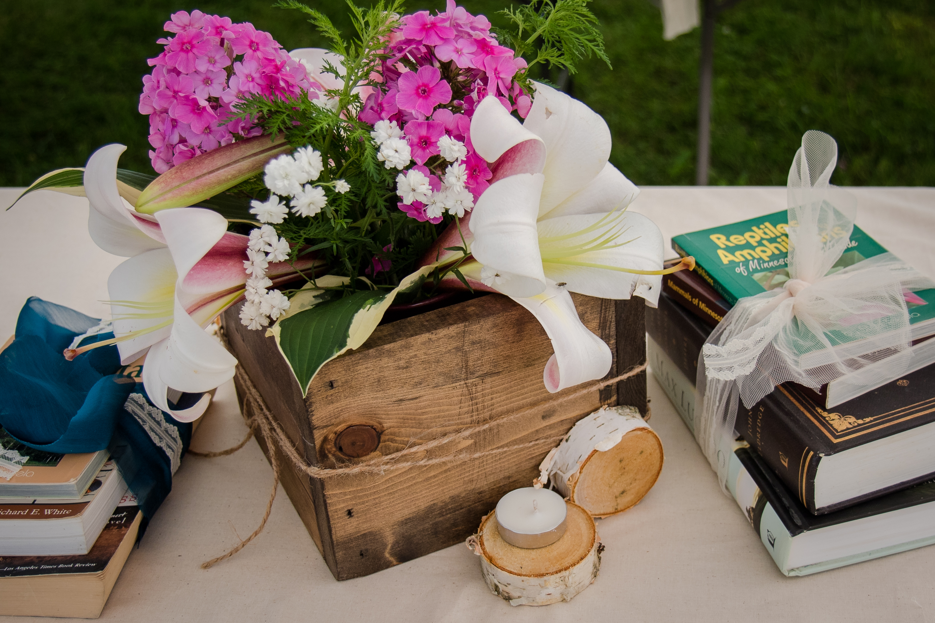 Choosing books to use as decoration was challenging. How do I choose just a few of my beloved books? Hmm, there were so many and I wouldn’t mind having all of them on display. How to choose, how to choose? Seriously girl, just hurry up and grab some, I told myself. I wanted a good selection, a broad selection, and some classics (partly because Mom had some really old ones that look awesome). There were several books I would have loved to put out but being more like textbooks in size, I figured they would be too big. I passed up The Rise and Fall of the Third Reich and went with The Decline and Fall of the Roman Empire. The books had to reflect my interests but also Jesse’s as well or at least of a connection to us. I had to include a couple of bee books – The Sacred Bees, A World Without Bees, A Fruitless Fall (the book that began my interest in beekeeping), Bees, and Bumblebees of North America. Alright, what else do I want out there? Obviously nature books that have inspired my writing and expanded my intellect – The Singing Wilderness, Of Time and Place, The Back Country, Desert Solitaire, Walden and other stories, The Geese of Beaver Bog, The Beaver’s Popple’s Pond, A Wildwood A Journey Through Trees, The Last Rhinos, Song of the Rolling Earth (given to me by Jesse) and not exactly nature writing but science and informational, The Wolf. A Walk in the Woods, Jesse and I both enjoy Bryson. History books – The Greater Journey, Explorer’s of the Mississippi, Canoeing Down the Great River, Minnesota. The History of Birds, not really a history book but a book on nature but mainly a really awesome looking antique book – and I love bird watching. Roadside Geology of Minnesota, because I just had to include a geology book since both Jesse and I find geology interesting. I’m not entirely sure what category it falls under but I had to include Animal, Vegetable, Miracle. Field guides: Wildflowers of Minnesota, Mammals of Minnesota, Trees of Minnesota, Reptiles and Amphibians of Minnesota, Field Guide to Nature of the Midwest, Insects, National Audubon Society Field Guide to North American Mushrooms, Mushrooms of the Upper Midwest. Classics, most of which I’ve read and partly for the antique books – Shakespeare’s Masterpieces, A Tale of Two Cities, Tom Sawyer, Notre-Dame De Paris, Robinson Crusoe, Crime and Punishment (and a book of Three Short Novels by Dostoevsky), Pride and Prejudice, Poe’s Masterpieces of Mystery – some of the classics were borrowed from my mom. Some beloved novels – The Chronicles of Narnia, The Heaven Trilogy (Ted Dekker), Lord of the Rings Trilogy, The Hobbit and The Fool’s Progress. Wrap up the diversity with some Christian living books – The Sacred Romance, Desire, Waking the Dead, Captivating, Come Thirsty, Traveling Light, and Next Door Savior. Well, there’s so many more I want to include but I think that’s plenty. I stacked the books in several piles as I pulled them off the shelves, and then made several trips, taking them outside to the tent and letting Anna know to include them. Jesse should bring some of his personal favorites; so I sent him a text hoping it wasn’t too late. He brought The Backpacker’s Field Manual, A Man on the Moon, Monkey Wrench Gang, Artemis, Fallen Giants – He didn’t really have time to grab more but too bad he didn’t grab one of his agronomy books, that was a topic we were missing. They stacked two to four books and tied them together with ribbon and some scraps trimmed off my dress and sisters’ dresses. I applaud them and am extremely thankful for the effort they put into the decorating. Along with the books, we used bouquets of flowers set into little wooden boxes (made by Jesse for Rachel’s wedding last year) and little candles set on small blocks of wood – very elegantly done. (Anna described the decor