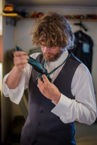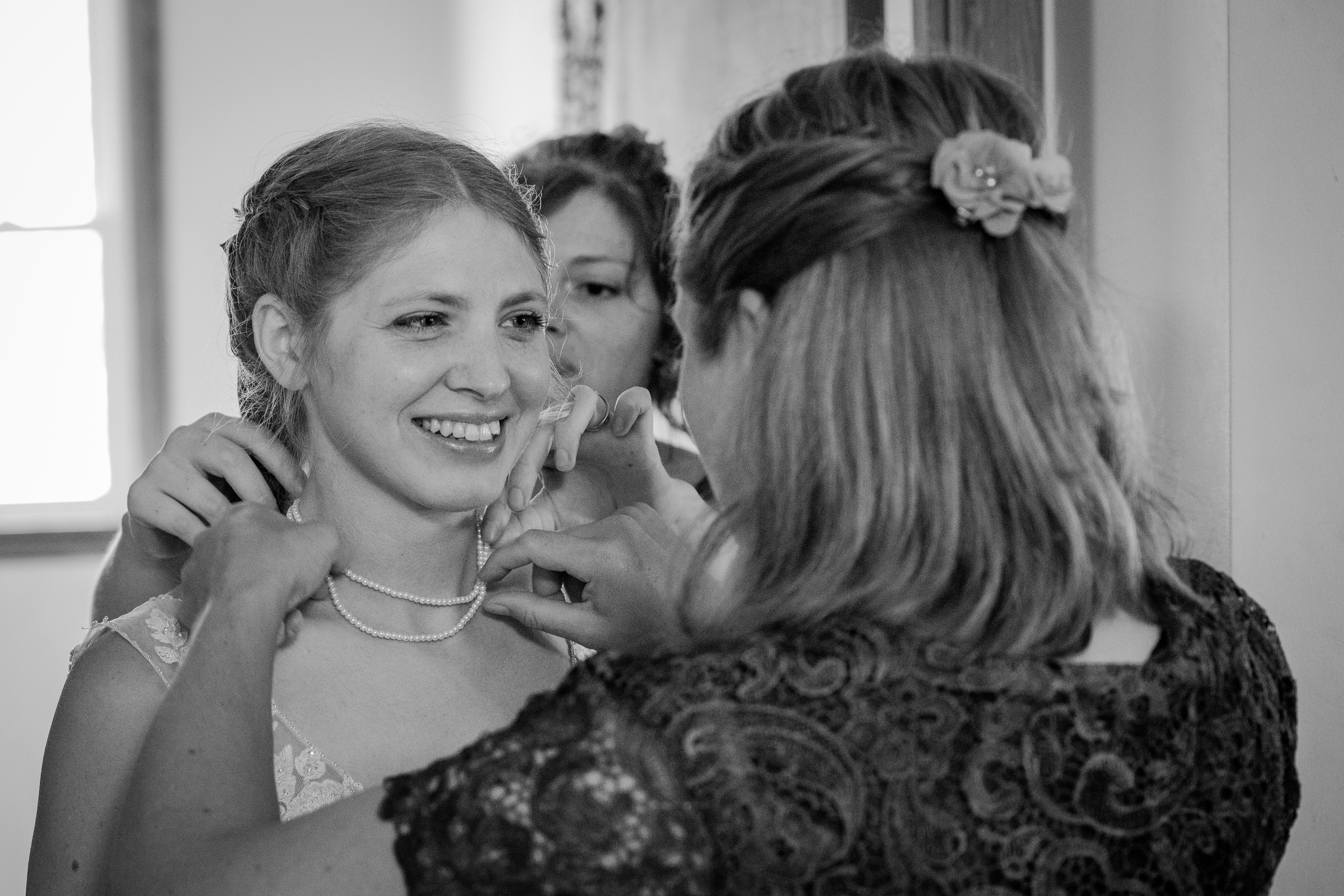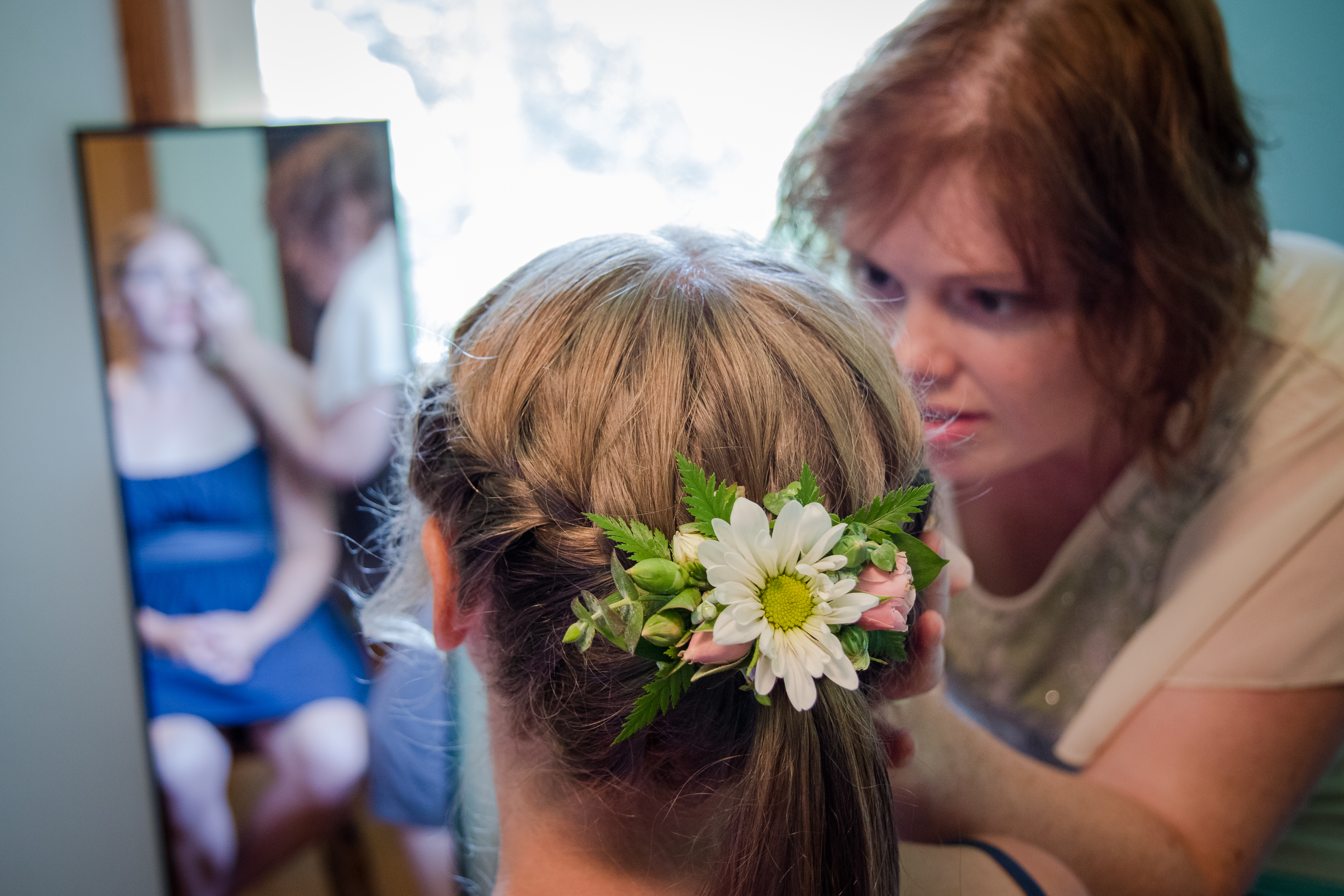 The other advantage to us girls getting ready in the north bedroom, other than being secluded, was that we could peek out the window at the guys and they had no clue. Of course, they were dressed and ready before us. Ben was taking photos of them outside in the backyard, in view of the window. But given the position of the window and time of day, they couldn’t see us. It was exciting to see them milling about in the backyard; being able to sneak a peek was thrilling and heightened my anticipation. Given the many layers of my dress, I needed help putting on my shoes. This also fell to Aleesha. I carefully took a seat, mindful of my skirts and with assistance from Aleesha slipped my feet into the shoes. Aleesha struggled with fastening them because they hook together, the buckles are just for looks. Also the hook came undone immediately on the first shoe, adding to the struggle. The shoes were slightly too big for me and not at all like what I usually wear, so I was really nervous about walking in them and not stumbling, tripping or having my walk appear clunky. Thankfully, most of the walking I would do, or at least that in front of an audience, would be done leaning on either Larry or Jesse, giving me stability. While Aleesha was dressing me, Johanna and Amber put on their dresses. Given the nature of fancy dresses, they couldn’t zip their own dresses. Amber was already in her dress and zipped up, and in the process of zipping Johanna’s when I asked Haley to capture that with her camera. I didn’t want that moment to be missed. It can be a little awkward having a photographer capturing these intimate moments but with Haley as the photographer it wasn’t awkward or uncomfortable but perfectly natural. Aleesha wasted no time getting into her dress, while Haley photographed me by the window; she took some artistic shots of me looking out the window. All three of my sisters went with flat comfortable sandals. I had told them since their dresses were so long and being an outside wedding, I didn’t care what they wore on their feet as long as it was nice. Each of them were also wearing matching hairpieces that were complimentary to those of the little girls, but with different hairstyles that suited each, and all were low key.