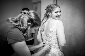 Johanna and Amber didn’t need their makeup done. Unlike Aleesha and me, they never leave the house without it on, just part of their morning routine. They did however, have to do their hair. There again though, they both did their own. Now that I was ready to go; Johanna began to do her own hair as did Amber. Aleesha’s hair and makeup was complete too. The next step was to get me in my dress, something I couldn’t do alone. Being my matron of honor, the sister I’m closest to and most comfortable with, it fell to Aleesha to help me into my dress. But before we did, Haley wanted to photograph me alongside, admiring the dress first.