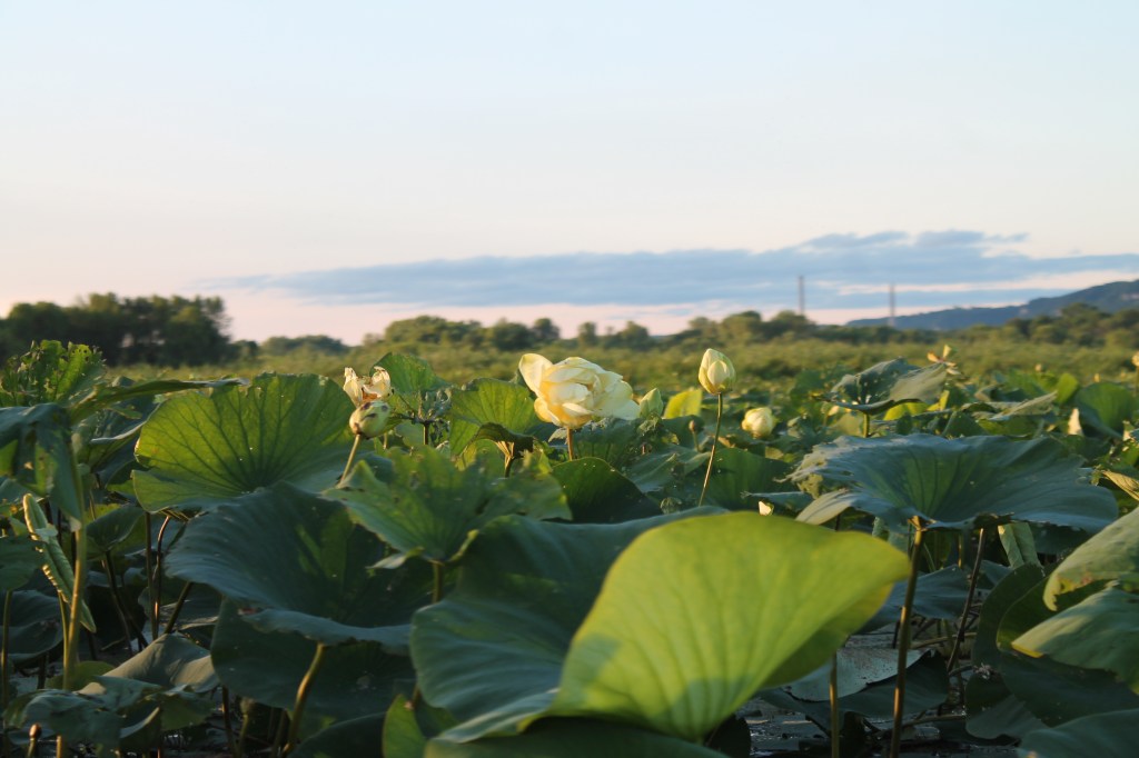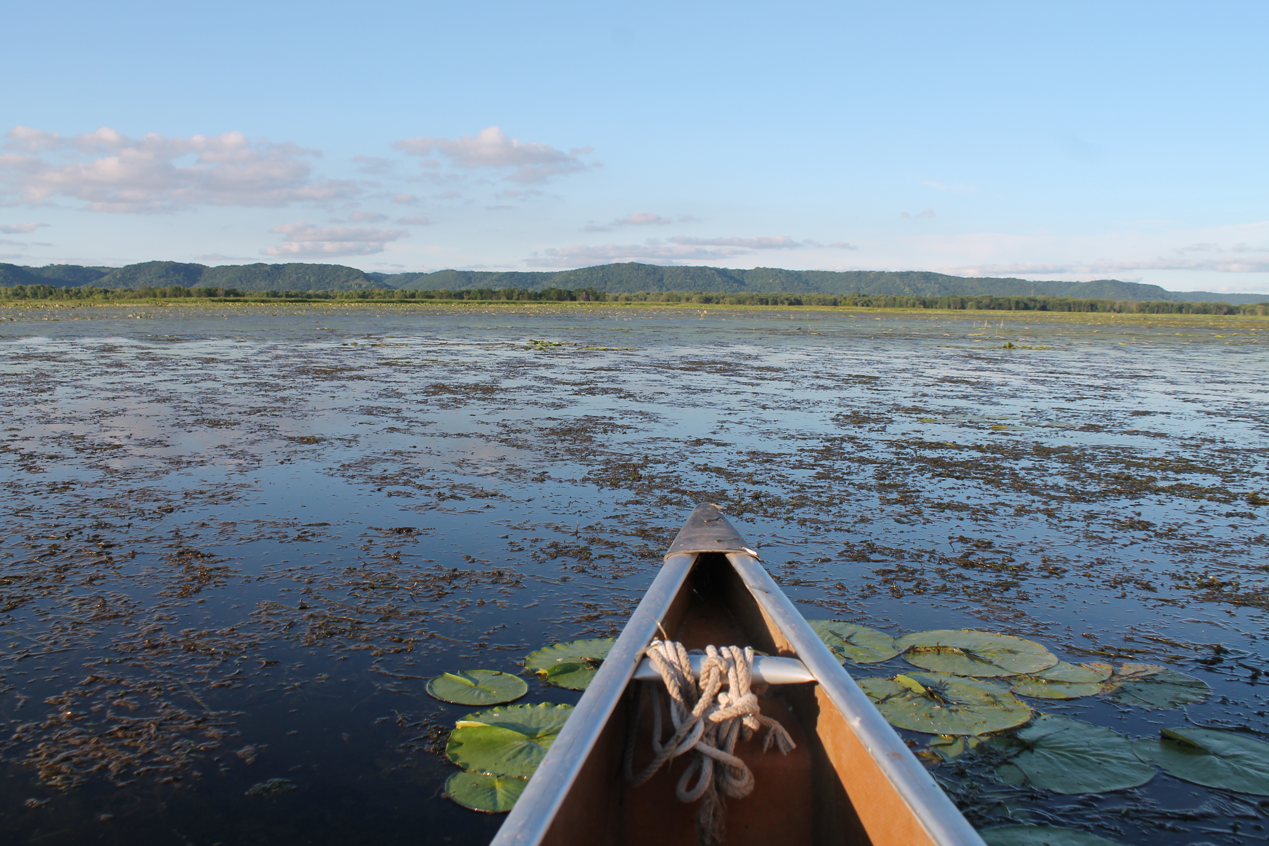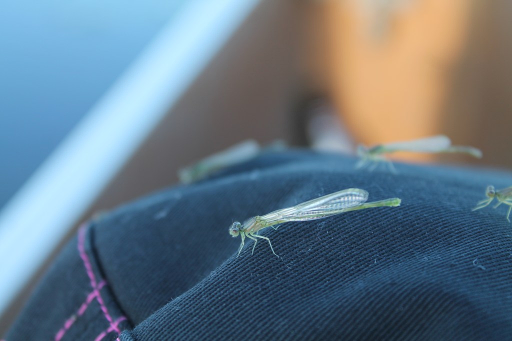 Every outing has something new to offer me – something that seems to be the draw of the trip. This evening it was damselflies. These miniature dragonflies, a relative of those fascinating hoverers, were everywhere and thick! I’ve never experienced anything like it before! It was incredible. They clung to our backs, hats, arms, legs. The vast lake stretched far out beyond us, its sheer size is quite humbling – reminding us humans just how small we are. Greenish yellow scum floated on the surface here and there, most likely a type of algae. If I looked just right, the water mirrored the sky. Far out across the water was a line of green vegetation, some of it lotus plants, the rest were most likely sedges – some quite tall. Far away, on either side of the ‘lake’ were bluffs cradling the valley. With the easy canoeing, the large field of aquatic plants drew near and near at a rapid pace.