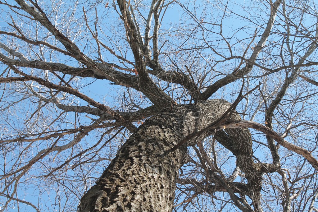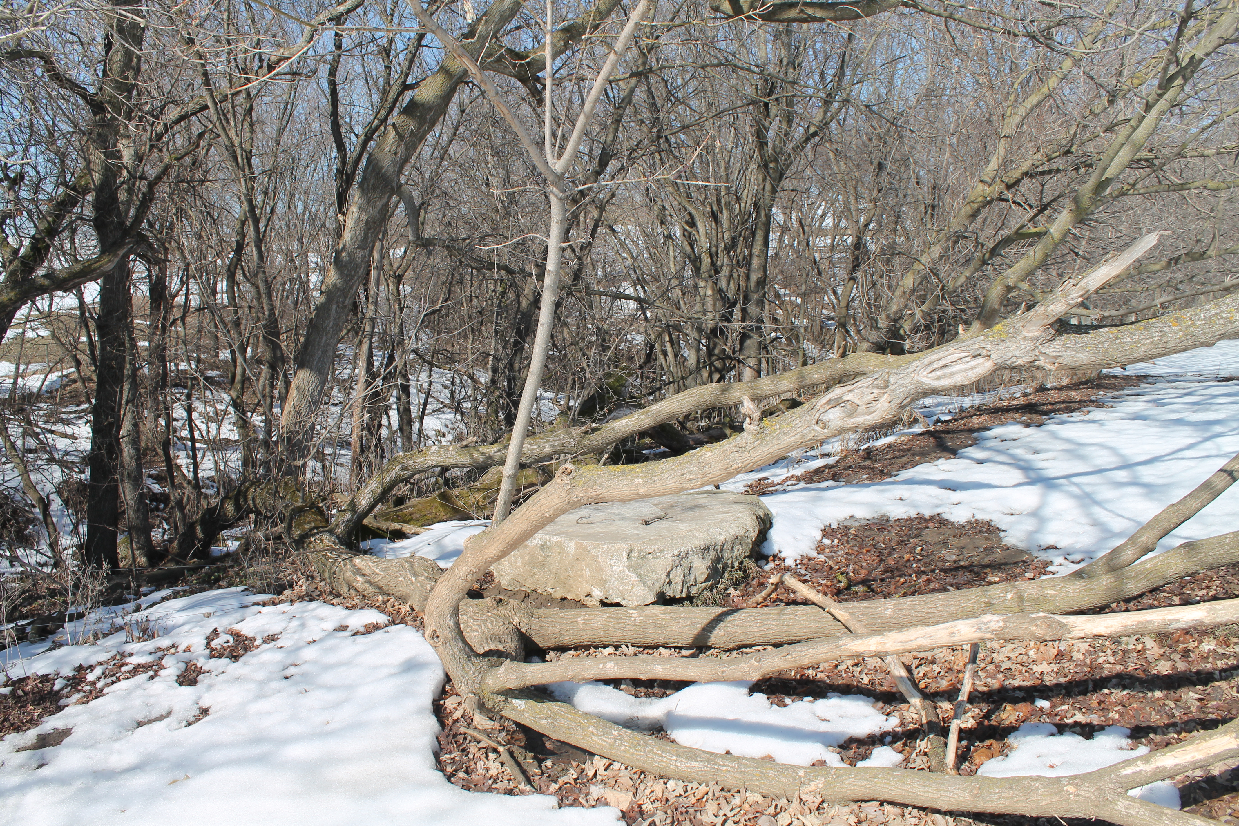 Is the water flowing in the ravine? Should I look? I slid off the log and resumed walking at 11:55 am, touching trees as I passed. I ran my fingers along the cool, textured, stone foundation and photographed it. A little bit of water flows down the ravine. I follow a deer trail, lots of droppings along it, and dip under a boxelder. A red tail hawk screeches. I tilt my head, crane my neck to see it but catch only a glimpse. No way to sneak up on a hawk. I keep rambling along the deer trail, pushing past brambles with thorns that grab at me. Admire and photograph trees – touch the ones I pass. A buck used the trail, bigger droppings, will I find a shed? Piece of a hollow tree stump sits on the side of the trail; I peek inside. Limestone outcroppings – good storybook inspiration. I cross a narrow ravine with flowing water, admiring trees. Snow crunched loudly underfoot. Two trees entwined and grew together. A nuthatch cheeped somewhere. A cow skull nearly buried in snow. I halt at a deeper ravine, considering how to traverse it. Squatting down, I pull out my journal and jot down a few notes, my backpack on a fallen tree trunk. I caught a glimpse of a woodpecker while writing – why didn’t I bring a longer lens? Downy or hairy? (I heard the sound of a large bird, particularly its wings as I wrote, wish I could identify it. Woodpecker drumming. Other birds sang in a high pitch. A squirrel stirred in the leaves somewhere.)