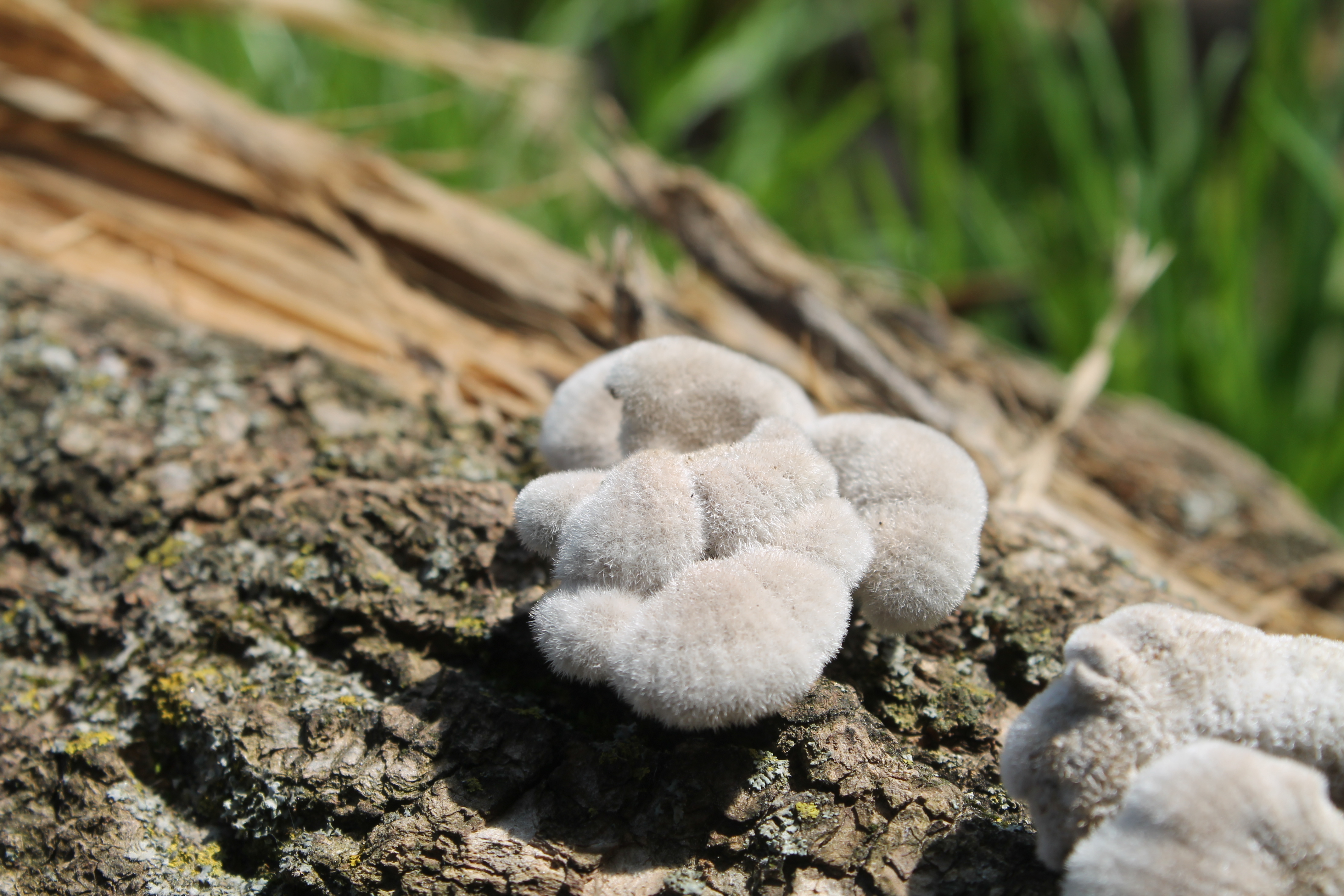 Ah, home. Finally, I start to relax and shed feelings of guilt. Why am I happiest in the woods? I desire to share it with someone but also enjoy going alone for solitude and moving at my own pace. I am enraptured by the trees, elm, boxelder, cottonwood, even the dead tree laying on the bank above the ravine. I step down into the ravine, breathe deeply – taking so many photos. A bright colored mushroom, golden brown like a bun, sprouts from a log. I walk a few feet down the ravine, until it curves. Distracted by the trees and then a mushroom, which is everywhere! I admire the ravine – rock strewn, trees growing out of the banks. More mushrooms. Glorious oak tree. So many mushrooms; I wish it were edible. The morning is warming as I walk. I climb out of the ravine, following mushrooms on the ground and trees. (Mindful of how I walk – heels down first. I scared up a grouse or something.) Dense undergrowth. Onward, I press, heading towards the stone foundation, so overgrown from March – very different from my visit with the girls in April. (That story is still waiting to be edited.) Torn between passing by the foundation or walking the ravine. I chose the foundation, somewhat following our path. Passing by the stones, I duck under the near horizontal boxelder. The undergrowth is so much thicker, too dense. Mosquito buzzing. Out from under the boxelder, I look back, momentarily considering climbing it. I would love the connection with the tree and it would be so easy, but I want to keep moving. I am getting hot. The undergrowth nearly obstructed my view of the small ravine ahead. Drawing up to it, legs fully extended, I step over it. Pushing past, ducking under, and dodging branches, I continue onward, arriving at the bigger ravine. I can hardly see the rock formation on the other side, toward the top of the slope. I amble down and back up out of the ravine, holding on to trees. Mushrooms like striped moths adhere to a tree.