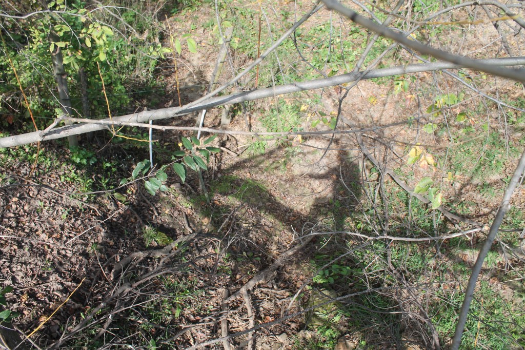 About to put my shoes on, nah, I keep going barefoot. (Like the difference between walking in nature and driving through it – more connected.) Crows caw. Sadly, my foot falls aren’t any quieter barefoot. Up the slope to the trail, I walk across the dead tree. This is amazing. Half tempted to ditch my shoes, will be back this way; but what if I need them. I check out the trees and rocks. I round the bluff. A sugar maple had fallen across the trail. I consider climbing it, but duck under and around the branches to keep going instead. A buck scat, careful not to step in it. Searching for a butternut tree, I focus down the slope and find what I think is it. I ditched my pack and shoes, and picked my way down the slope, maneuvering between trees for support. The terrain is steep and hazardous. I paused to take photos and then climbed back up the slope.