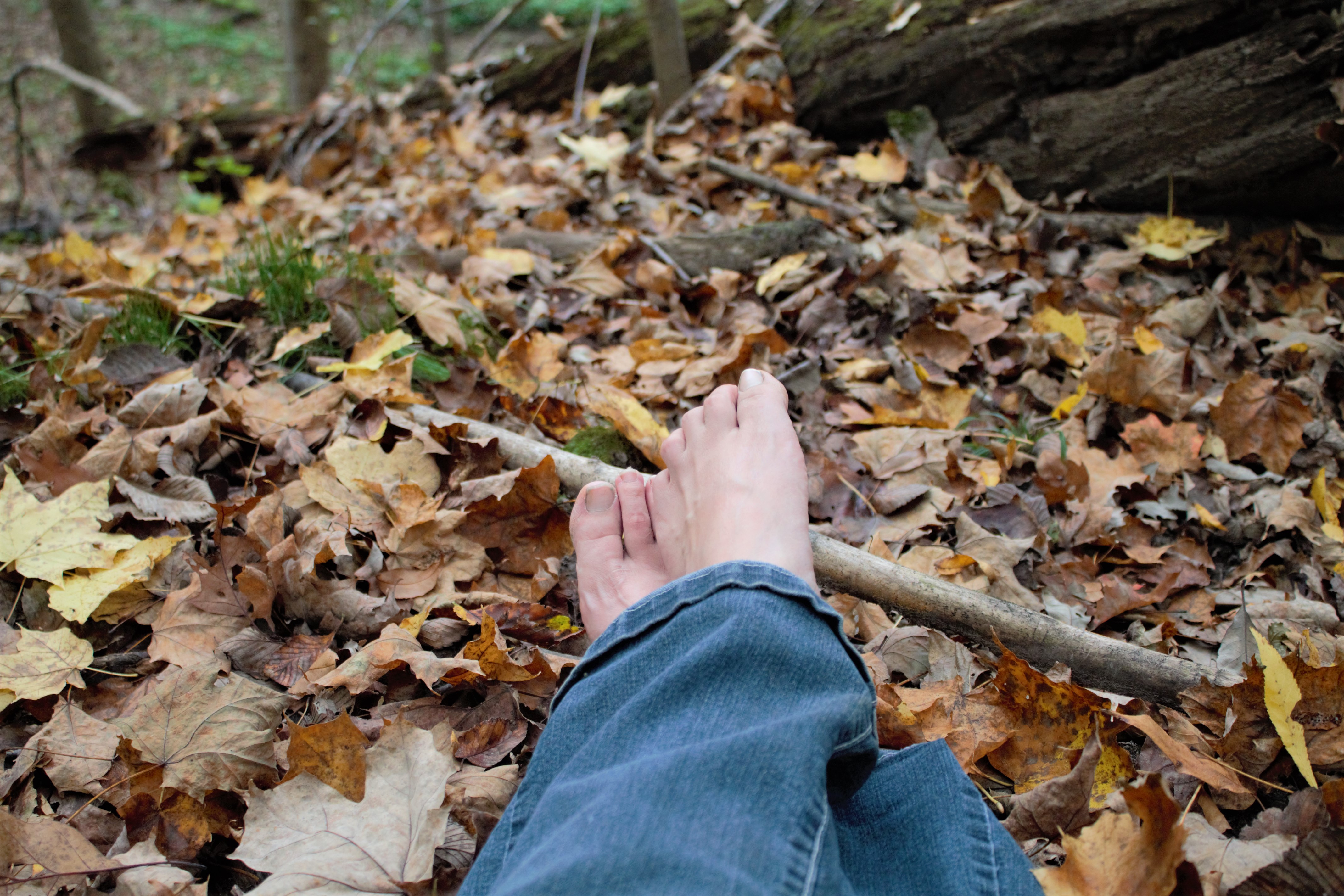A few steps away, I almost stumbled over the cow skull – covered in leaves, teeth revealed. Bright mushrooms lampshade shaped on stalks, glow below the rocks. I pondered climbing the rocks, but decided not to this time. My soul lifts again – maples gorgeous, not much for undergrowth. Brown shelf mushrooms decorate trees. I am overcome with the desire to walk barefoot. Probably not a good idea – oh what the heck. I pause to take off my shoes and socks, tread on a carpet of maple, elm, and oak leaves. Enjoying being barefoot, I can really feel the woods. The sky is becoming overcast. And I am more in the breeze again. I sit down on the soft hillside overlooking the wide ravine, admiring the trees. A maple leaf dangles from a spider’s web, dancing in the breeze. A murder of crows cackle. (One calls another responds – are they talking about me?) I think this is my spot more than by the foundation; I love the openness. I hate the highway noise though. Wish I knew the names of all the plants, running my fingers along the tree bark. I looked through field guides. I had a snack, took notes, and sat for over an hour. Leaves falling on me. Getting cold after sitting awhile, I should keep moving and look for a butternut tree.