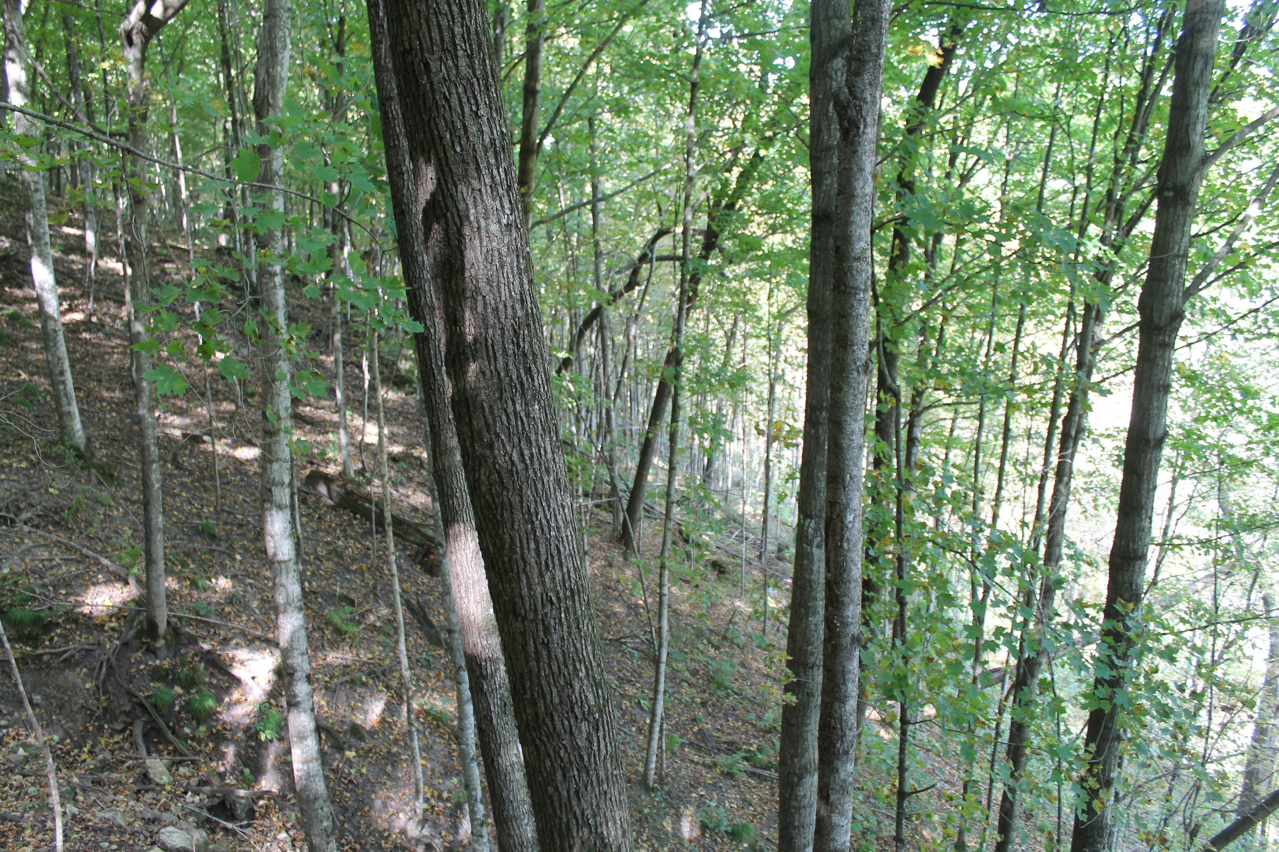 “Yeah, I wish I didn’t have to milk this afternoon/evening, and could just stay out here.” Reluctantly, we headed back westward. If we went west and down, we’d find the vehicle. We weren’t lost. I marveled in the maple trees of various age and size as we traversed the bluffside. So lovely. Horsetails grow in clumps in an area of bare soil. Branches and logs lay strewn here and there. The bluffside was steep; each step had to be taken with care. Our feet slid in the loose dirt and leaves. Anne had found nice paper birch limbs for us to use as walking sticks. This sort of terrain was my paradise. Anne was enjoying the adventure but nervous about the difficulty of the trek. She slipped and slid roughly a foot or two and let out a shriek. “I almost died,” she laughed.